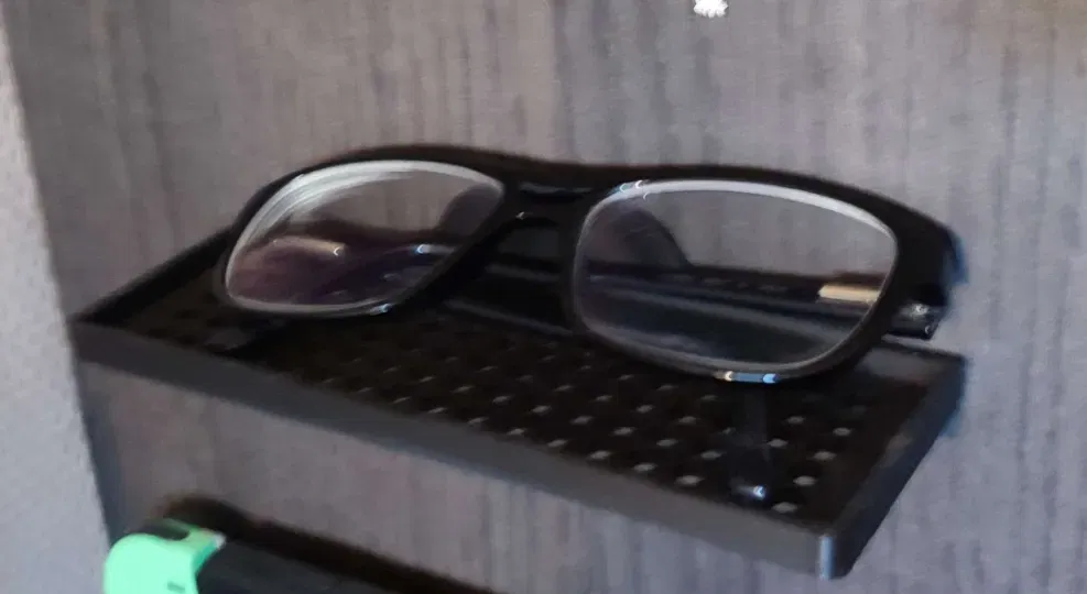 Một giá đỡ kính mắt đơn giản gắn tường. Có thể không vừa với tất cả các loại kính. không có vít, tôi chỉ sử dụng băng keo hai mặt mạnh.