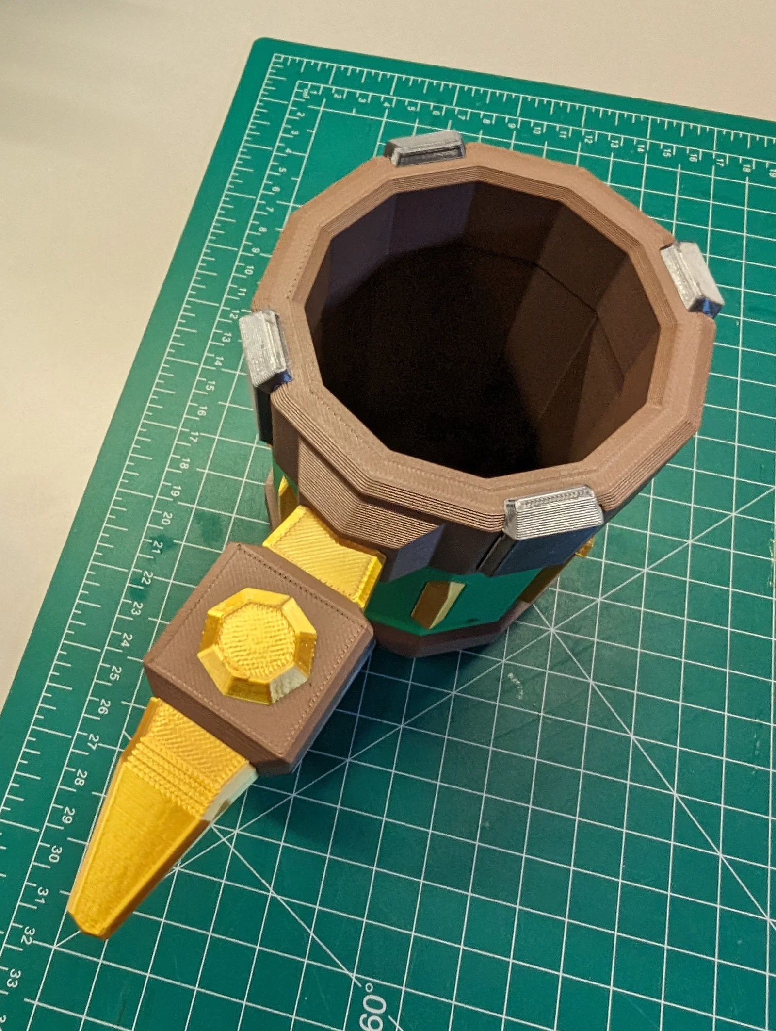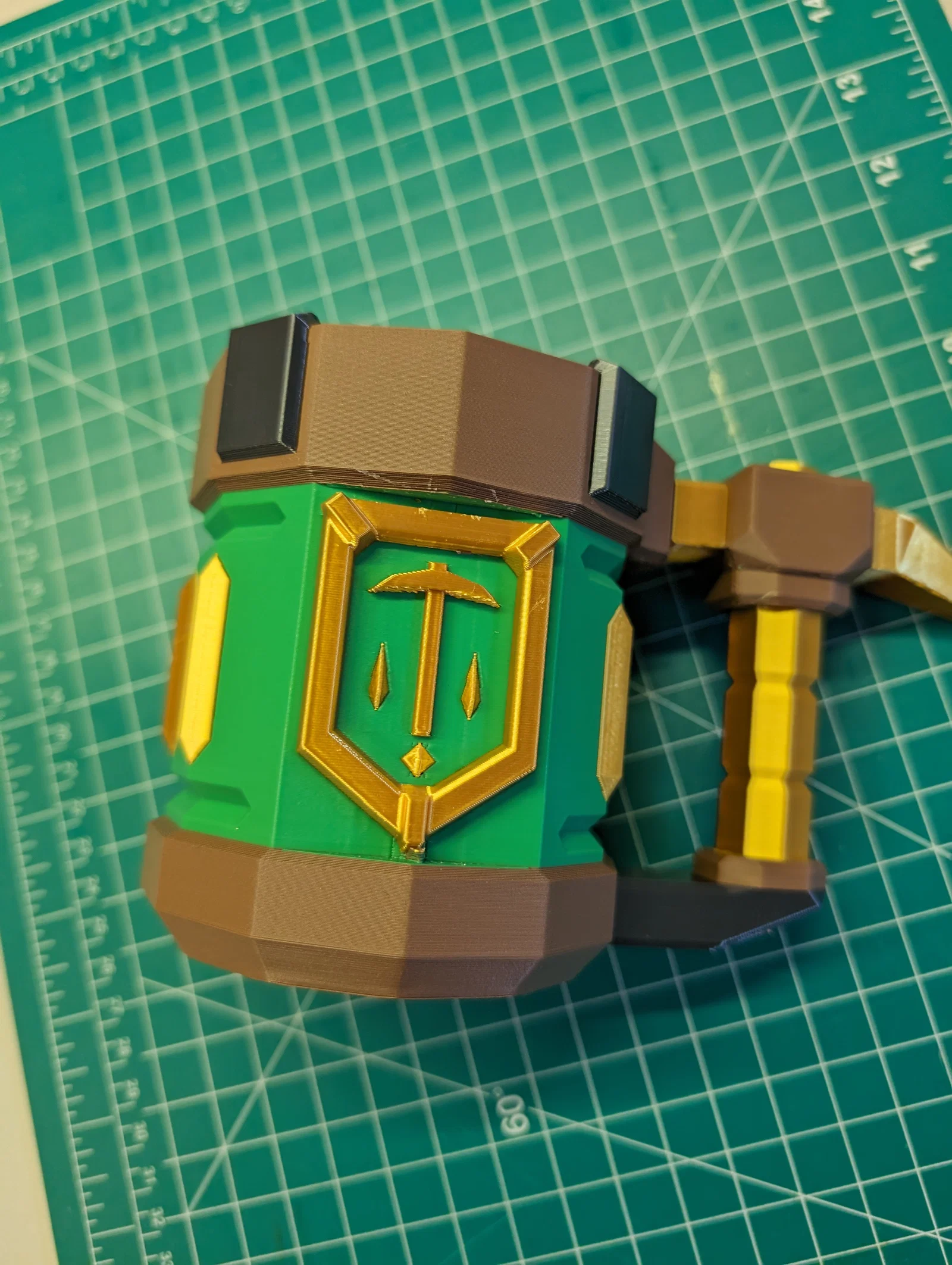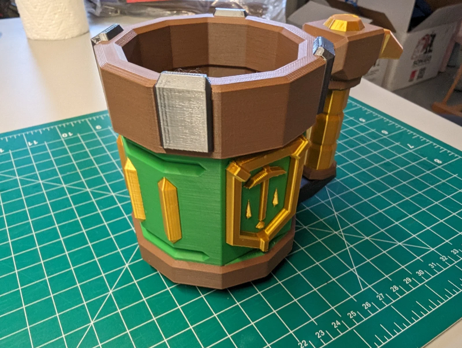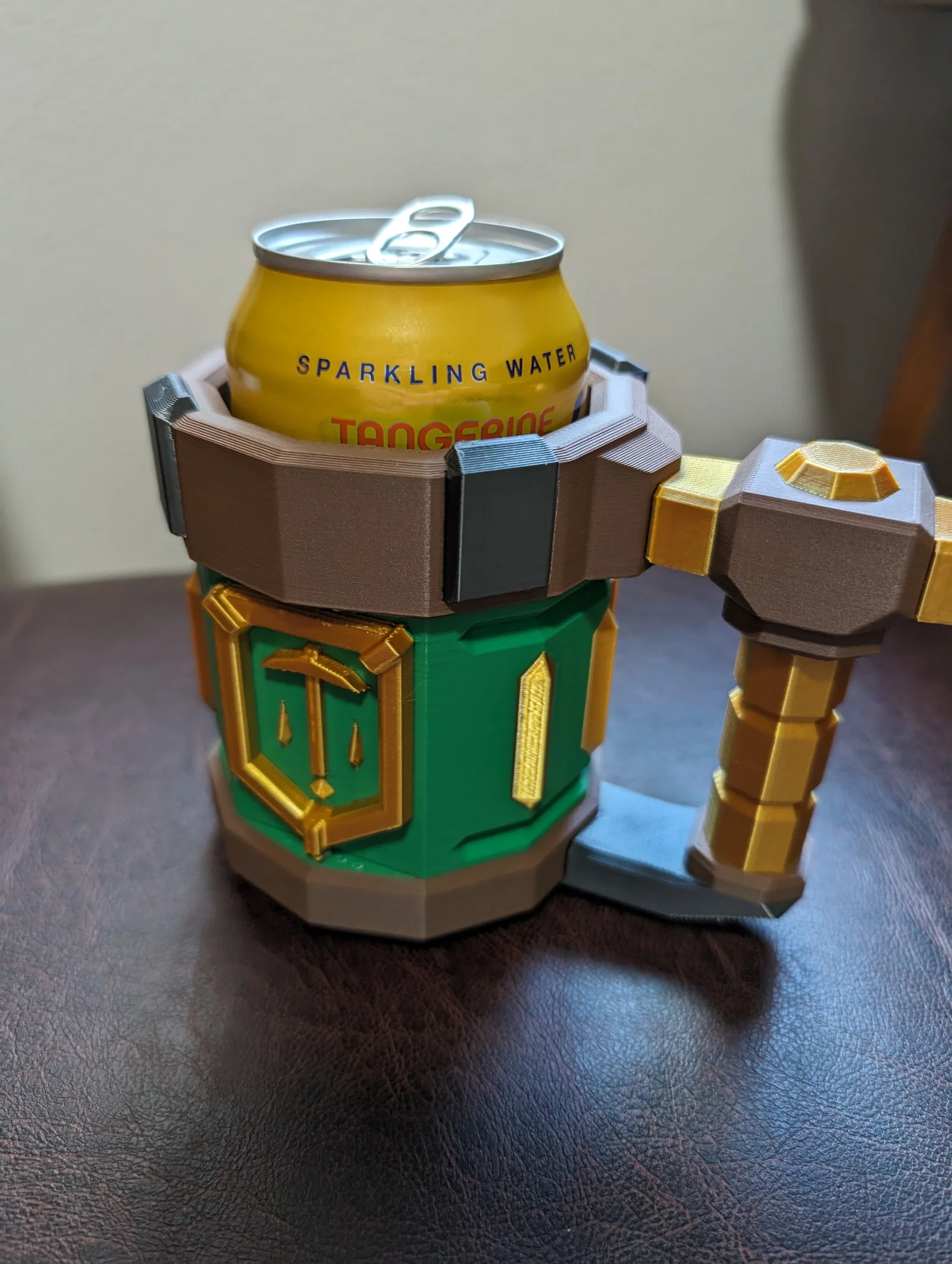 Phiên bản 4 màu của ly bia “buff” trong Deep Rock Galactic, theo phối màu Pots O' Gold. Thiết kế canh chuẩn để lắp vừa khít lon 355mm/12oz; nên in natural orientation và dùng organic/tree support.