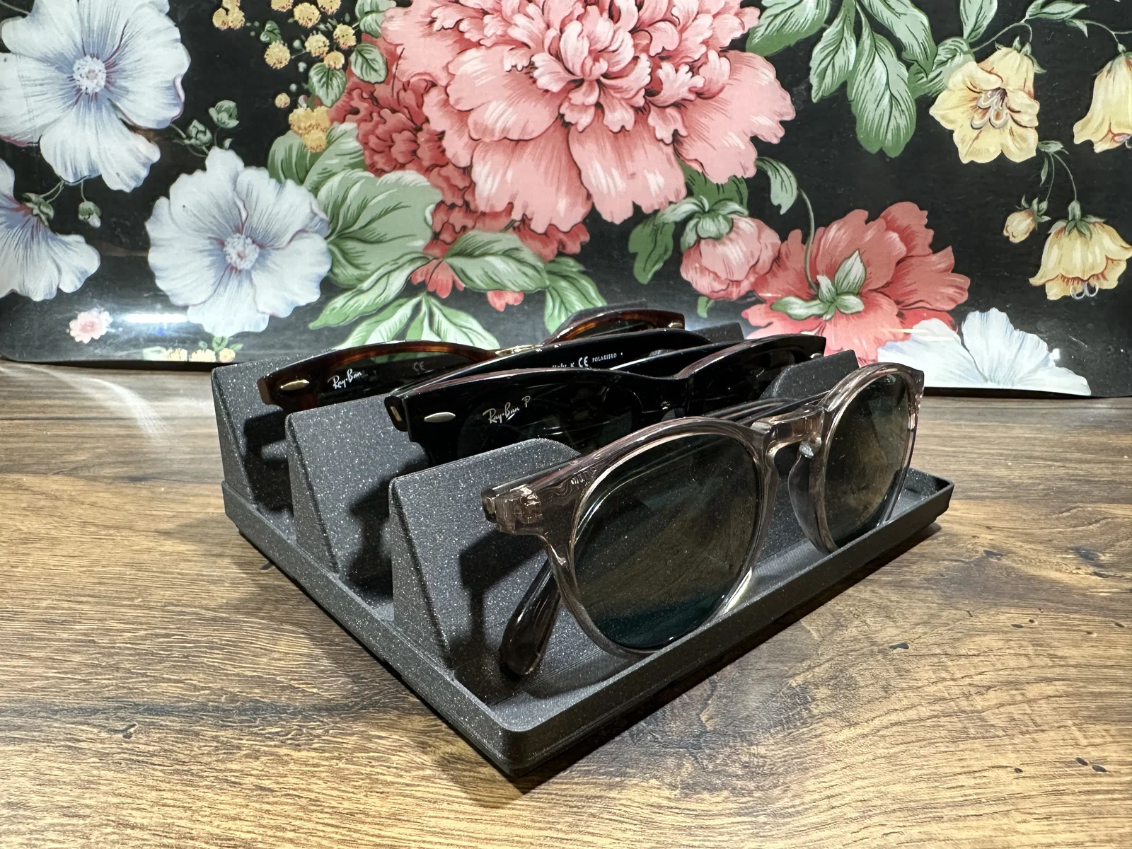 Module Gridfinity 3x giúp bạn cất tối đa 3 cặp kính mát/kính gọn gàng. Có kèm bản 4x1 cho 1 cặp. Lỗ nam châm Ø6.1mm sâu 2mm, hợp ép nam châm 6x2.