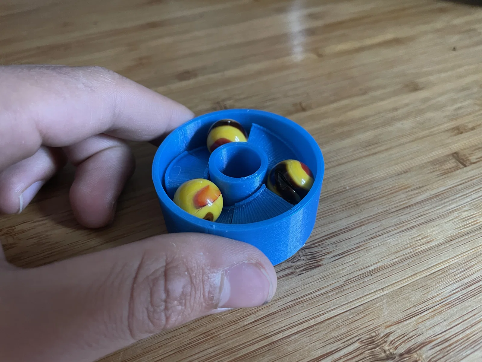 Một món đồ chơi nhỏ dạng print-in-place, cho tối đa 3 viên bi (marble) vào trong. Khi bạn kéo vòng ngoài lên xuống, các viên bi sẽ chạy vòng quanh trong “máy”. Các dốc trượt thay đổi vị trí sẽ đẩy bi đi mượt mà, rất hợp để làm đồ chơi fidget.