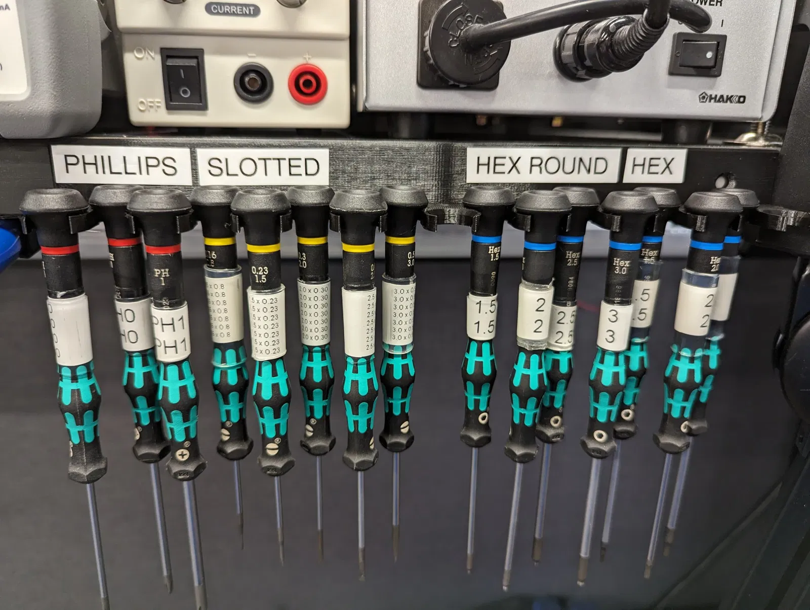 Cần một giá đỡ để giữ 17 tua vít Wera Kraftform Micro từ đầu của chúng, vì vậy tôi đã thiết kế cái này. Bạn có thể sử dụng băng dính hai mặt để gắn hoặc hai con vít.