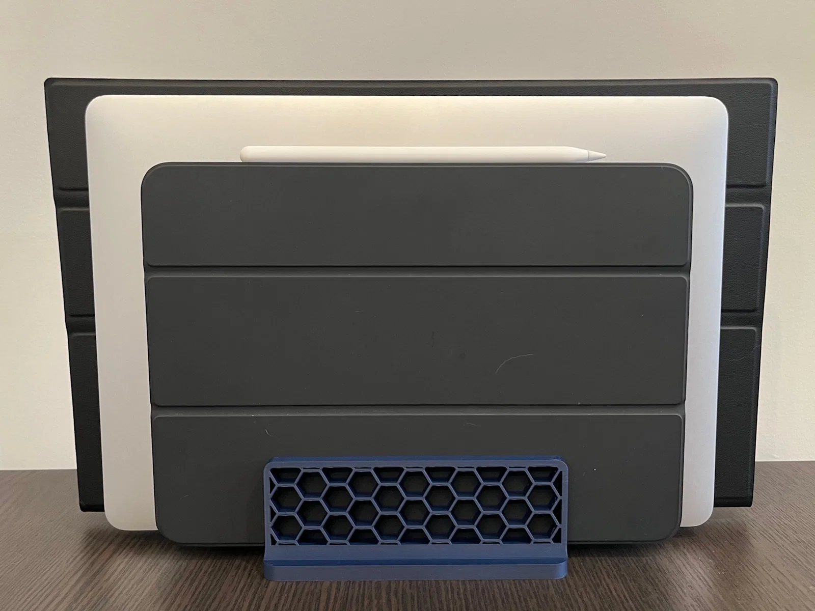 Chân đỡ thiết bị dạng parametric, dùng được cho thiết bị nhỏ tới lớn với độ dày bất kỳ. Có tuỳ chọn hoạ tiết khoét lục giác để đẹp mắt và tiết kiệm filament. Tuỳ chỉnh trong OpenSCAD/Customizer.