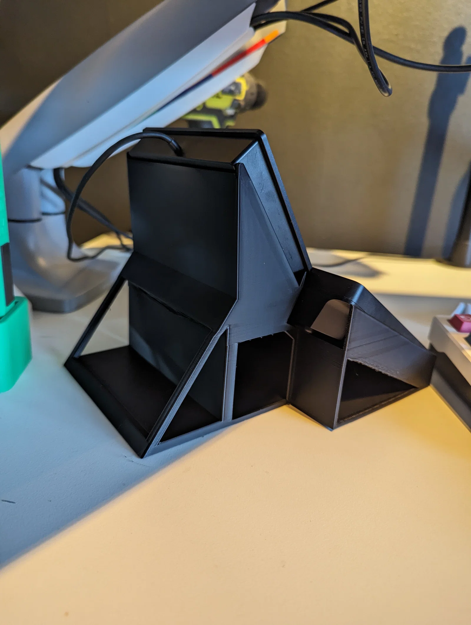 Ngay sau khi có máy in 3D, mình đi kiếm kiểu giá đỡ như vầy. Mà tìm hoài chỉ thấy hàng làm sẵn bán trên Etsy, nên mình tự làm rồi in ra một phiên bản “tệ” hơn.
