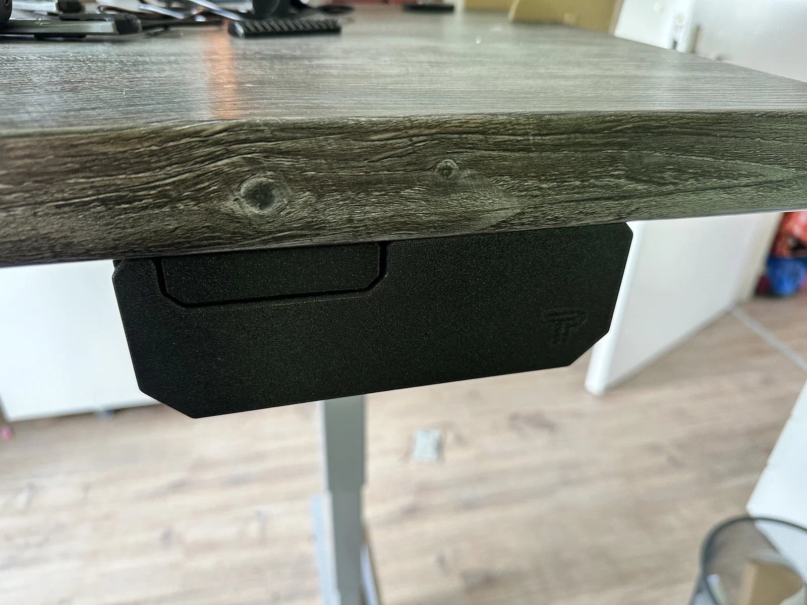 Bản remix ngăn kéo gắn dưới bàn/desk dạng trơn, không có holder đặc biệt, thiết kế để bắt vít vào mặt dưới bàn. Có kèm file .3mf với modifier giúp thêm chữ/hoa văn khắc (engraving) ở mặt trước.