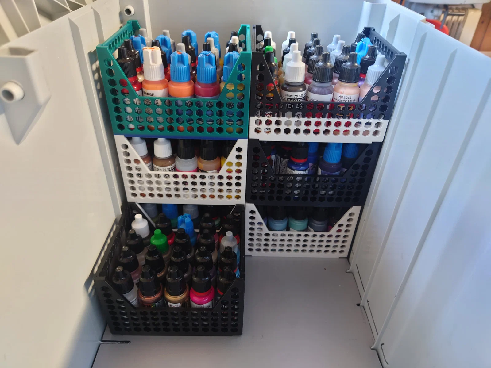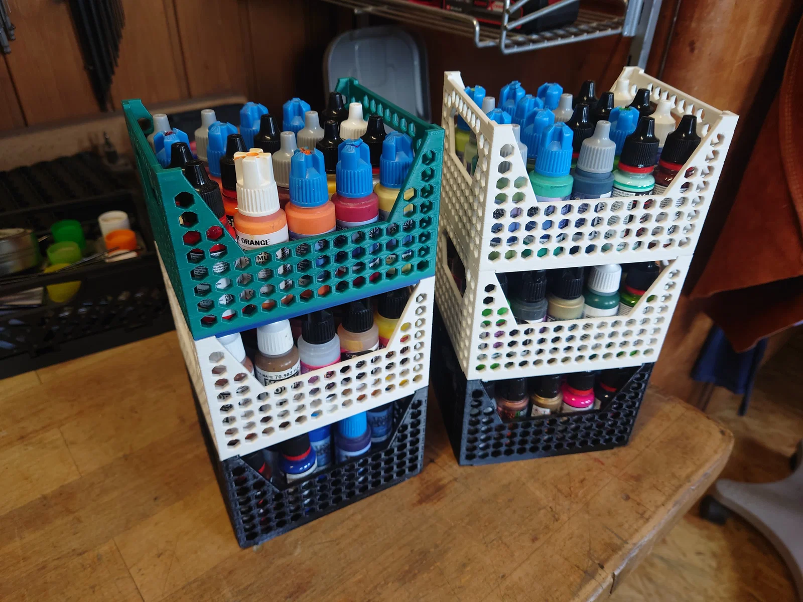 Mình có chia sẻ các loại kệ/hộp xếp chồng (stackable) có hoặc không gắn nam châm ở phần đáy, dùng cho chai 18ml và 200ml của Vallejo hoặc các hãng tương tự.