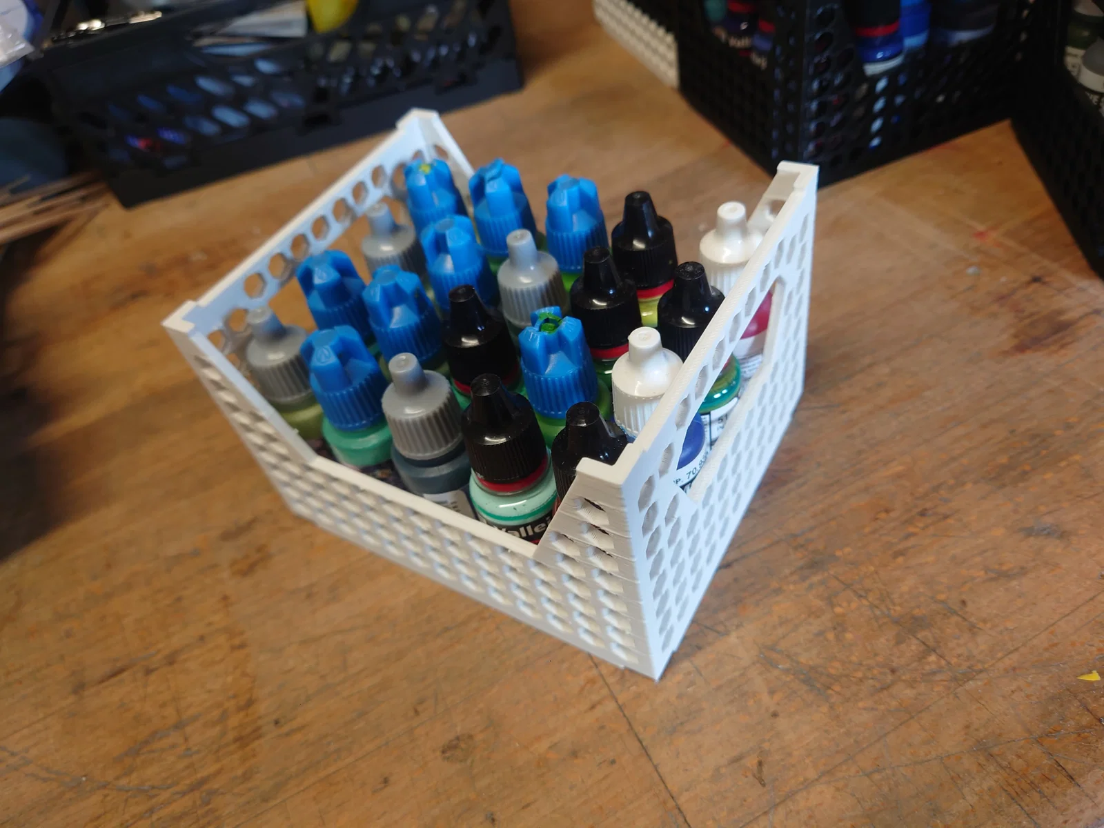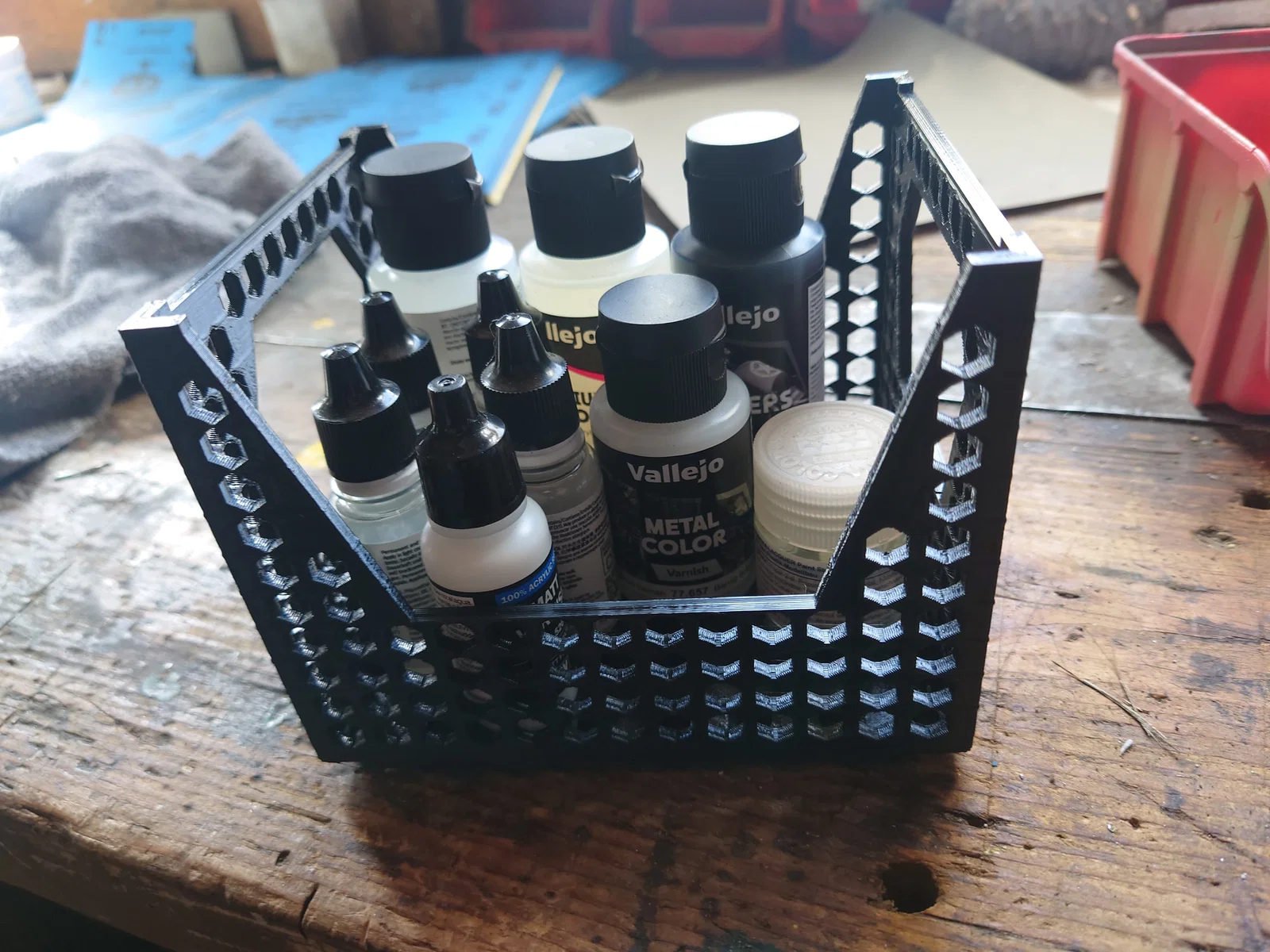I am offering stackable boxes with and without magnets in the base for 18ml and 200ml bottles from Vallejo or similar manufacturers.