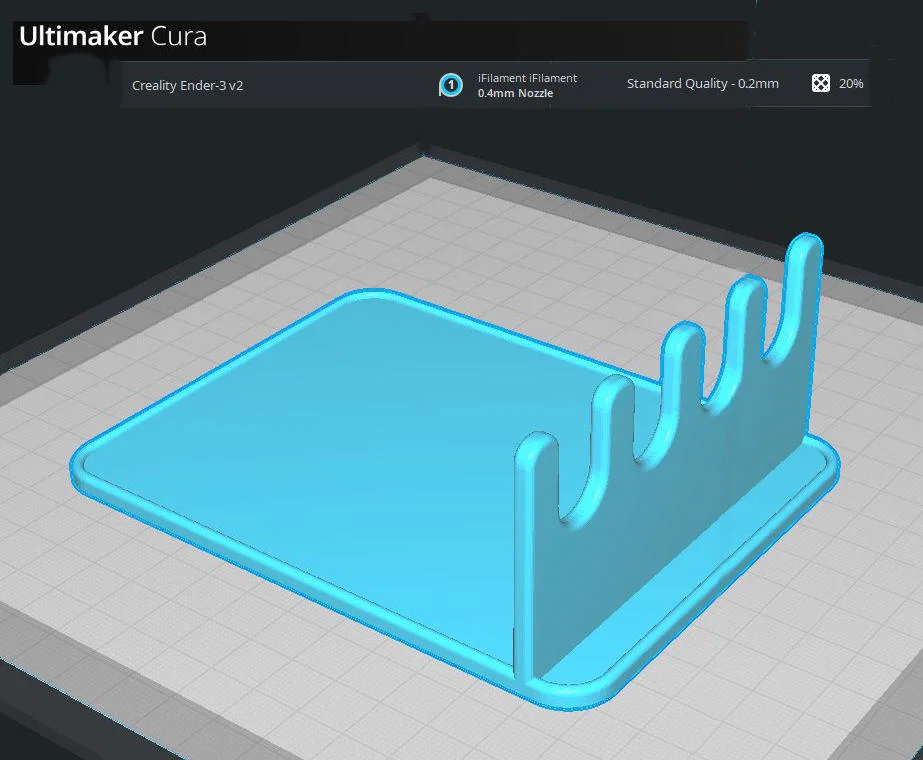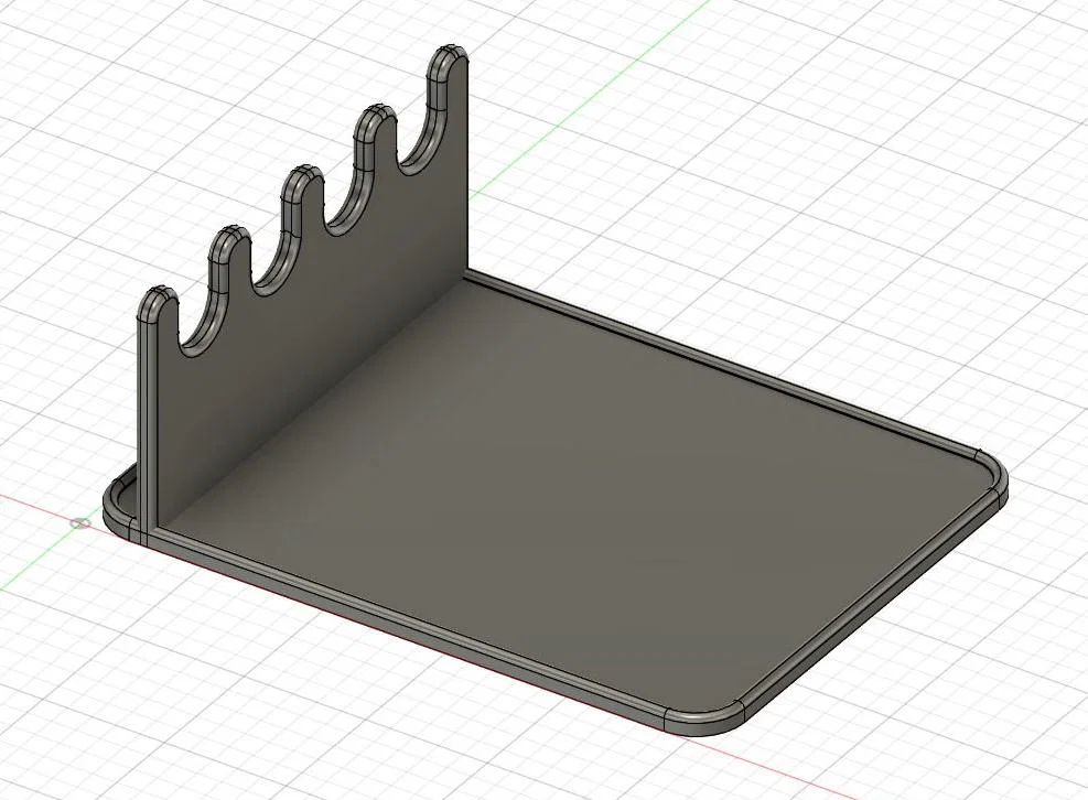 Khay gác muỗng kiểu nhiều khe, tự thiết kế vì loại mua online thường là silicone hoặc chỉ có 3 khe. Kích thước 130×100×50mm, nặng khoảng 41g. In PLA, không cần rafts/supports; infill triangles, vách dùng gyroid.
