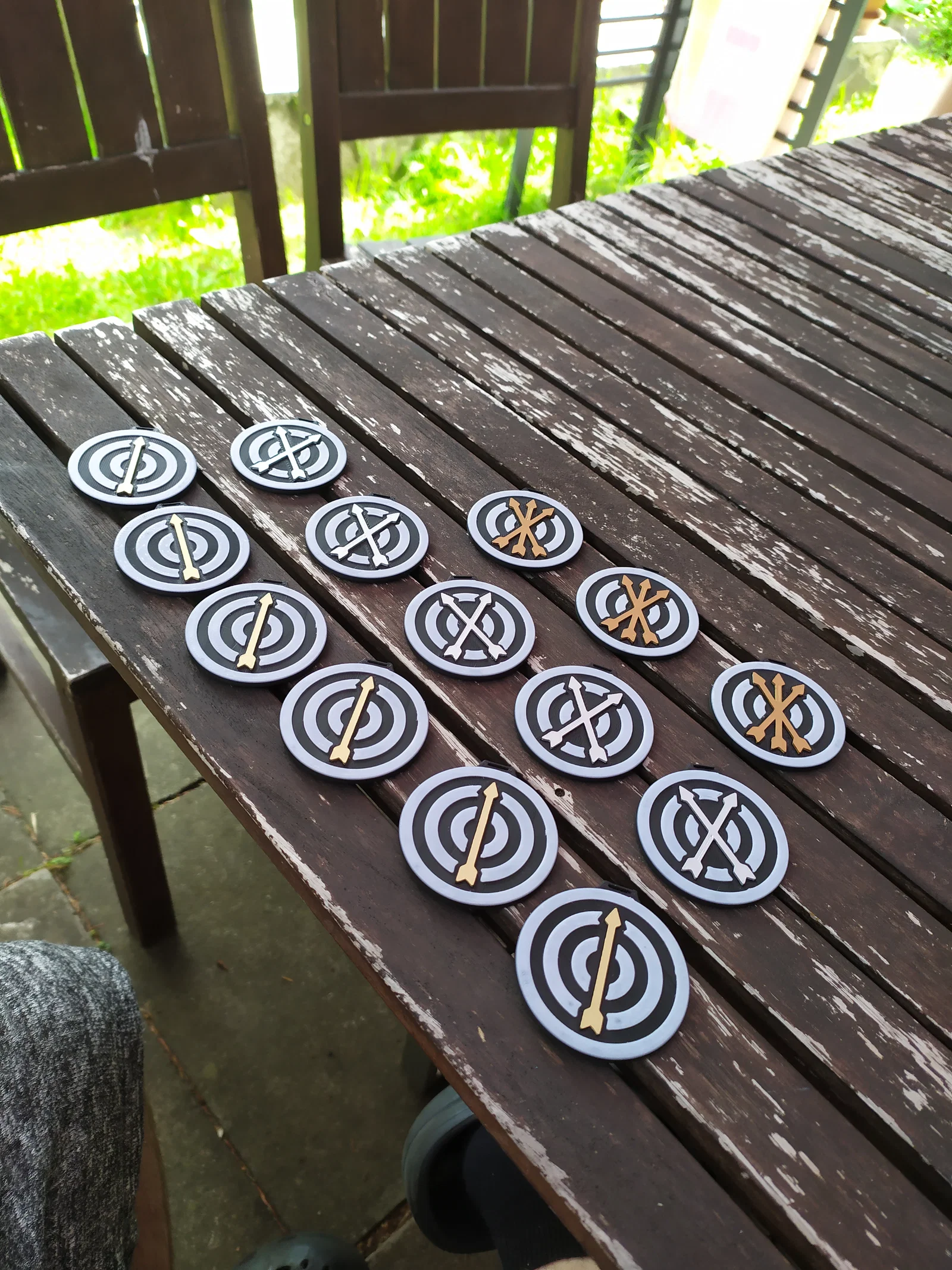Mình làm mấy cái huy chương này cho các bé tham gia giải bắn cung. Phần mũi tên được thiết kế thành một miếng rời vì mình sơn phần đó bằng màu acrylic vàng, bạc và đồng rồi dán bằng keo superglue. Phần khe ở phía trên được chừa để luồn ruy băng bản 7 mm. Cứ thoải mái thử những phối màu đẹp hơn đen-trắng nha. Lúc đó mình không có sẵn filament nào xịn hơn.