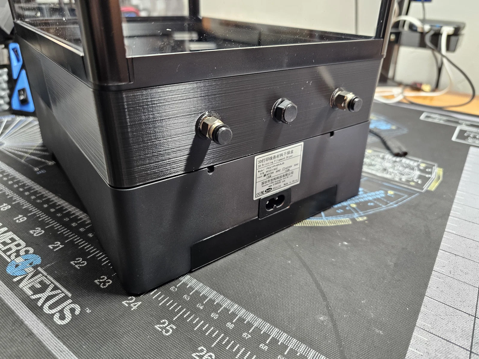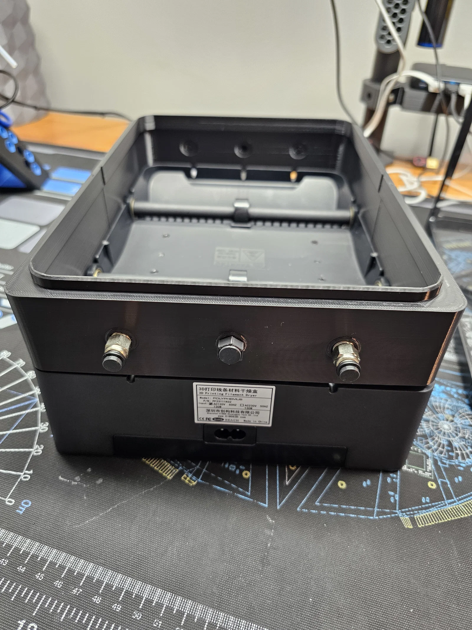 Mình làm mẫu này để tiện đổi vị trí ống PTFE đi ra thường xuyên hơn, đồng thời vẫn cho phép để được cuộn filament cao hơn trong máy sấy. Dù Polyphemus cho phép lắp ống PTFE xuyên qua phần đế thay vì đi qua nắp như Cyclopes, mình vẫn thích dùng các đầu nối khí nén cho ống PTFE hơn. Nó cũng dễ gắn nút bịt để giúp giữ nhiệt bên trong, hướng luồng khí nóng lên phía lỗ thoát ở trên nắp.