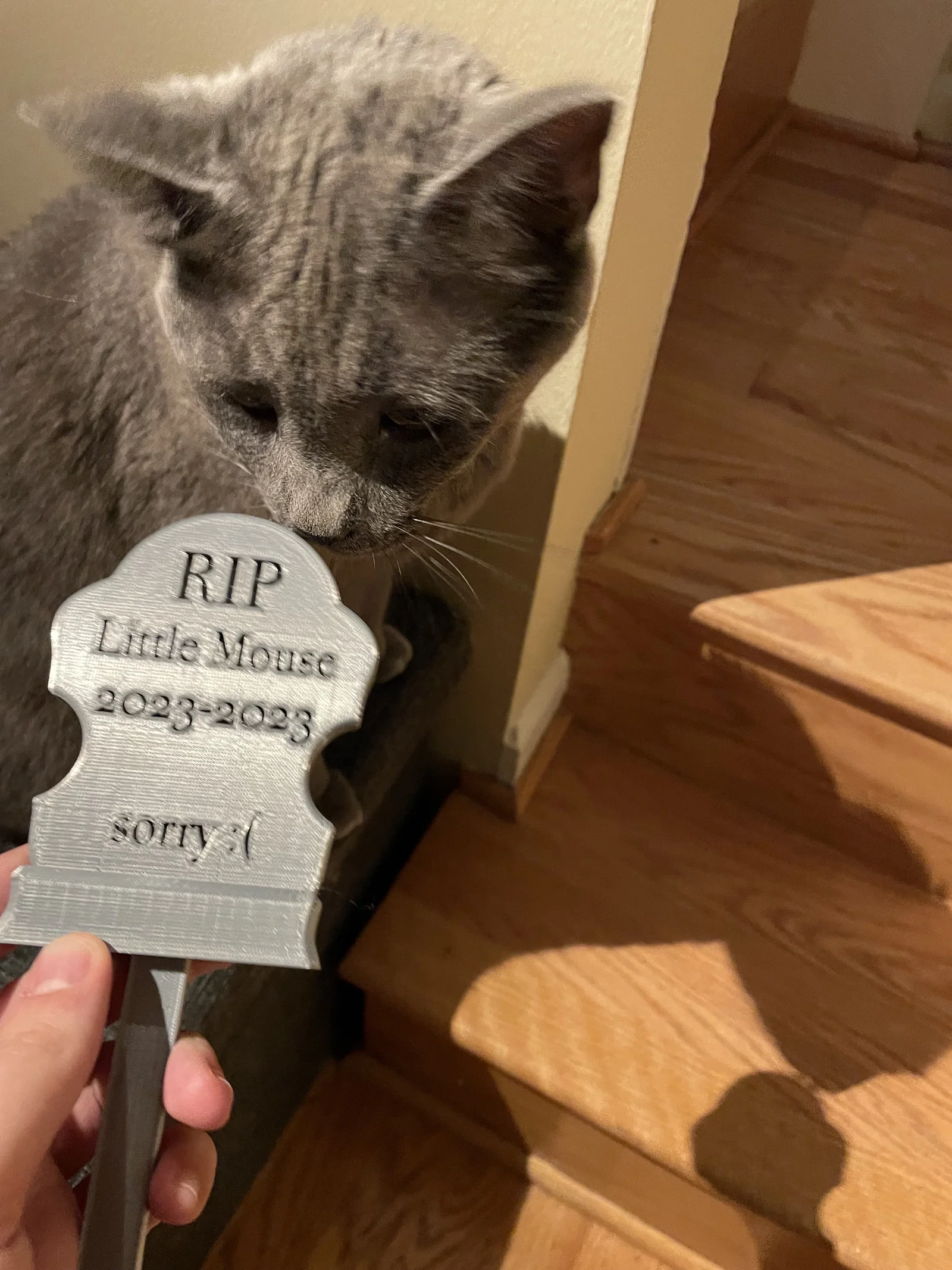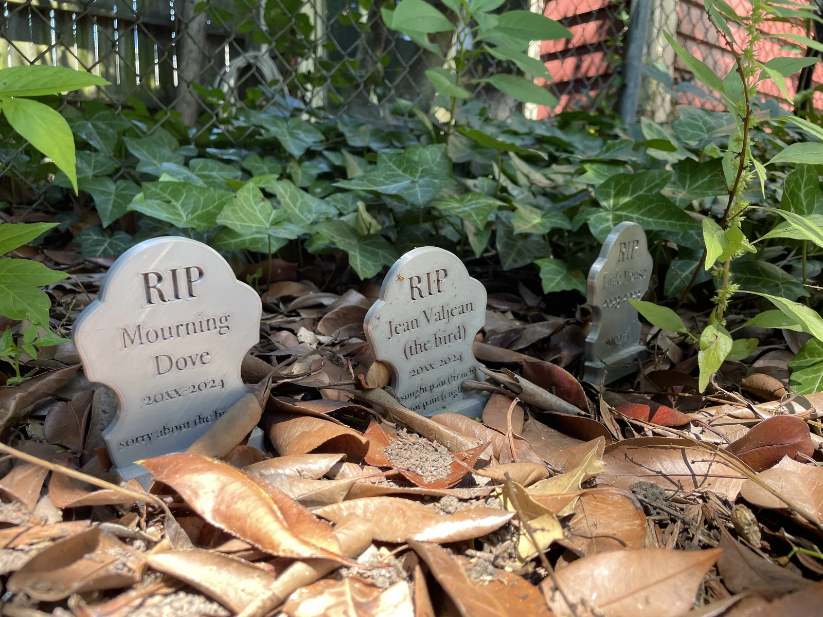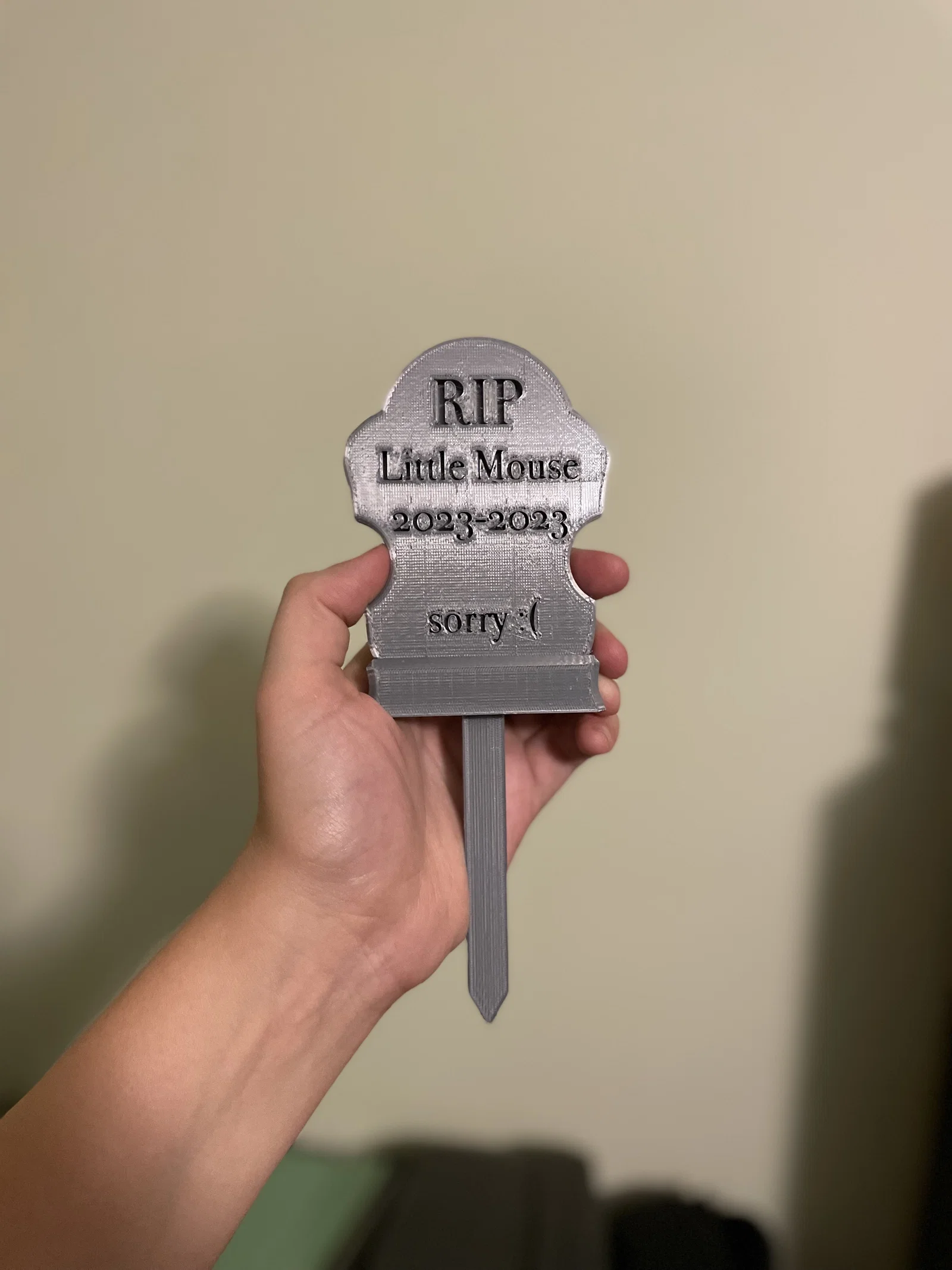 Bia mộ mini để trống kèm stake cắm xuống đất, bạn có thể viết/đính chữ để làm bảng trang trí Halloween hoặc tưởng niệm “cư dân” xấu số trong vườn. File 3mf tách rời bia và cọc, dễ chỉnh kích thước.