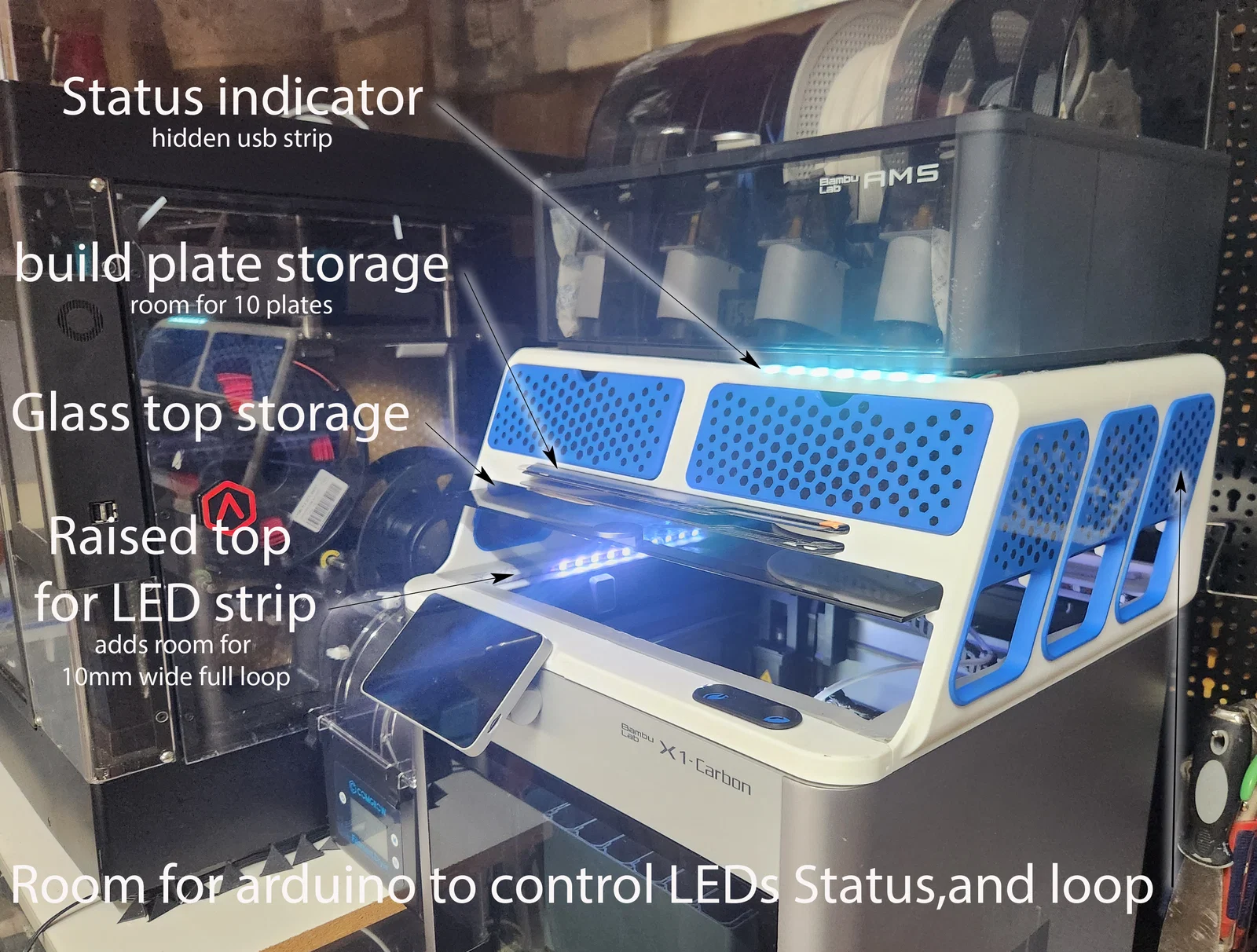 Bản AMS Riser R2 cho Bambu Labs AMS: riser có ngăn kéo, plate và hệ đèn LED chạy full loop quanh viền. Có ghi chú lắp ráp, chọn LED strip individually addressable, nguồn, Arduino Nano và cấu hình WLED.