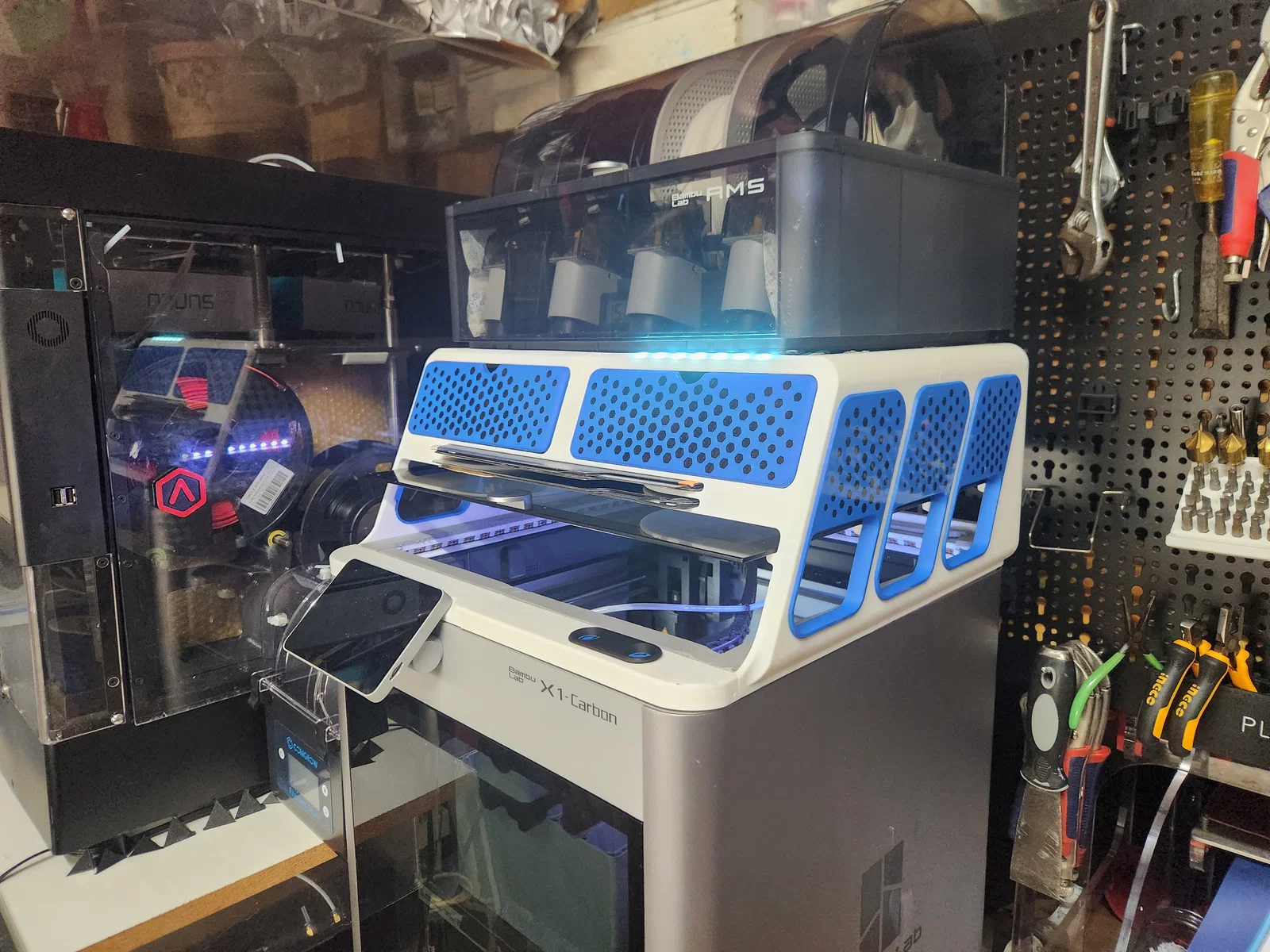 Ý định của mình là sau khi sửa xong các lỗi trong phần lấy thông tin từ máy in, mình sẽ thêm status indicator lên nóc máy in. Mình đã đi dây sẵn, chỉ chờ cấu hình. Rồi mình thiết kế thêm một món có thể để trong văn phòng, hiển thị progress bar và status indicator. Máy in của mình không đặt gần bàn làm việc, nên có một cách nhìn trạng thái nhanh sẽ tiện. Nhiều lần máy in pause mà mình không biết. Có nhiều cách xem camera như Bambu Studio hoặc Bambu Handy. Nhưng mấy thiết bị đó đôi khi đang bận việc khác. Một thay đổi tương lai khác là thêm nút phía trước để bật hết đèn. Có thể thêm một núm để chỉnh độ sáng. Mình đang nghĩ phần này sẽ thay cho các chi tiết nhỏ phía trước gần nút nguồn của máy in. Mình sẽ không dán keo các chi tiết đó.