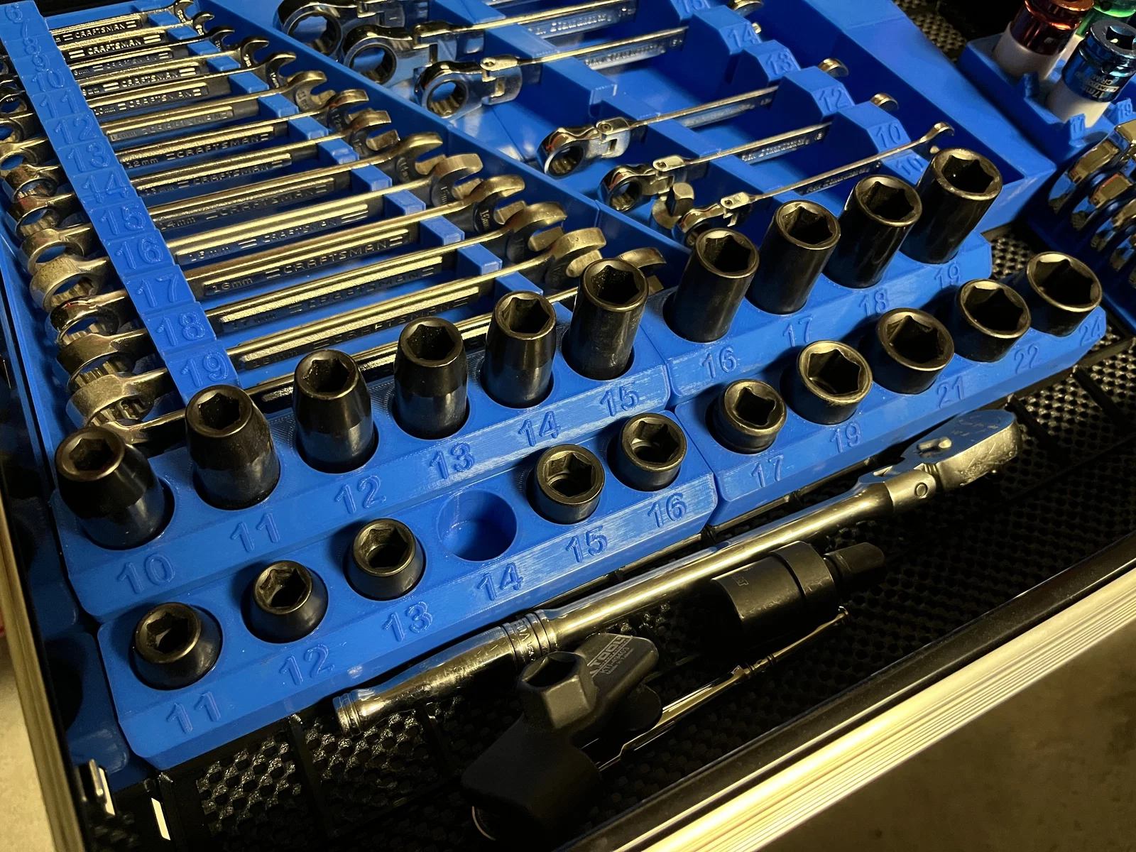 Mình làm đủ cho socket nông (shallow) và socket sâu (deep) ở hệ metric, còn hệ imperial thì chỉ làm loại shallow. Có thể sau này mình sẽ chỉnh lại các socket deep cỡ 16–19 để chừa chỗ cho wobble adapter đầu 1/2" của Icon hoặc Kobalt.