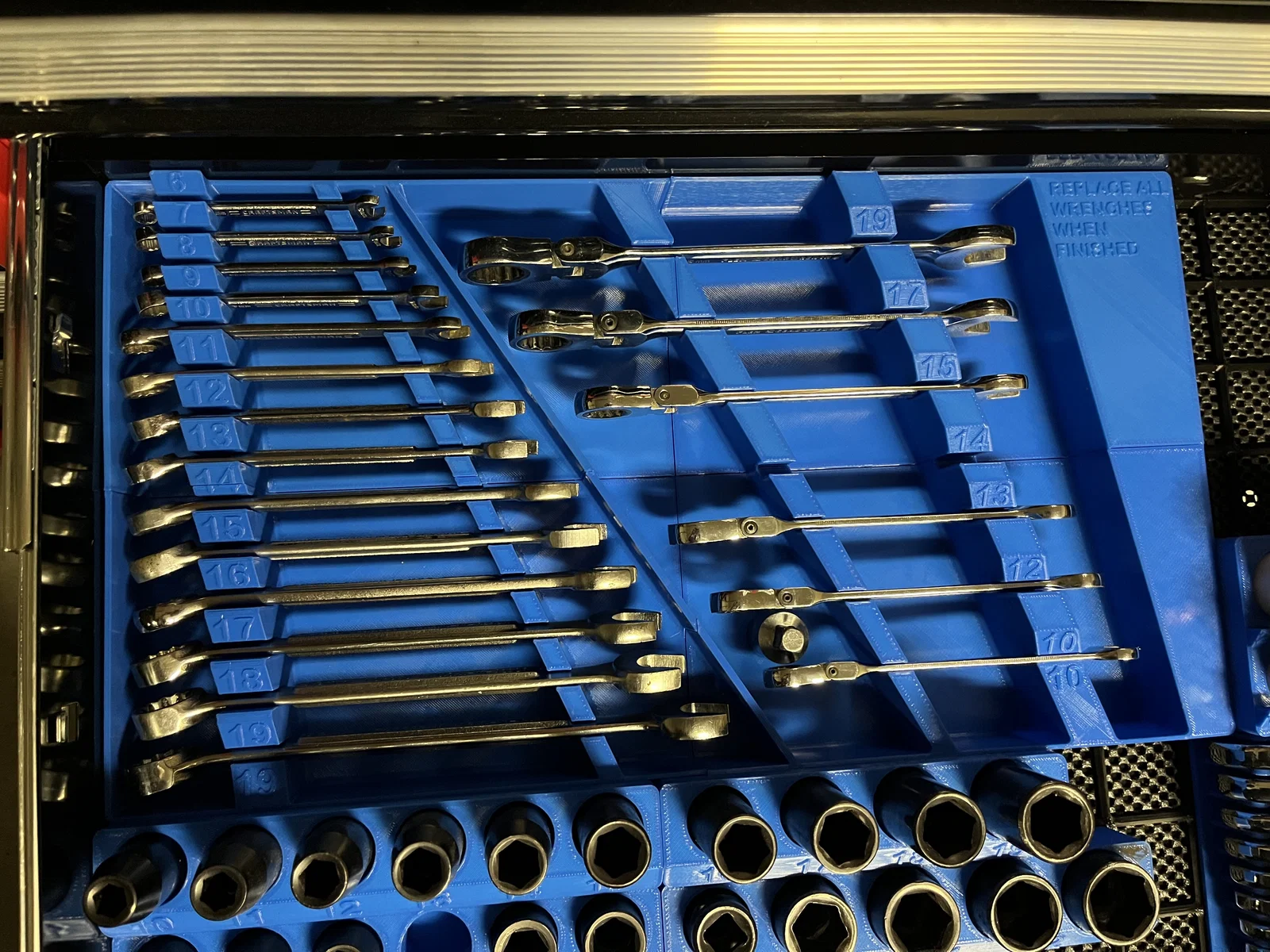 Mình thiết kế mấy khay/holder cờ lê Gridfinity này để vừa bộ 14 cây cờ lê Craftsman raised panel và bộ 7 cây cờ lê Gearwrench loại ratcheting. Tiếc là sau khi làm xong thì mình bị mất cây Gearwrench 14mm; nó bị “nuốt” vô khoang máy, không rớt xuống đất, giờ chắc đang nằm đâu đó trong cản (bumper) xe luôn.