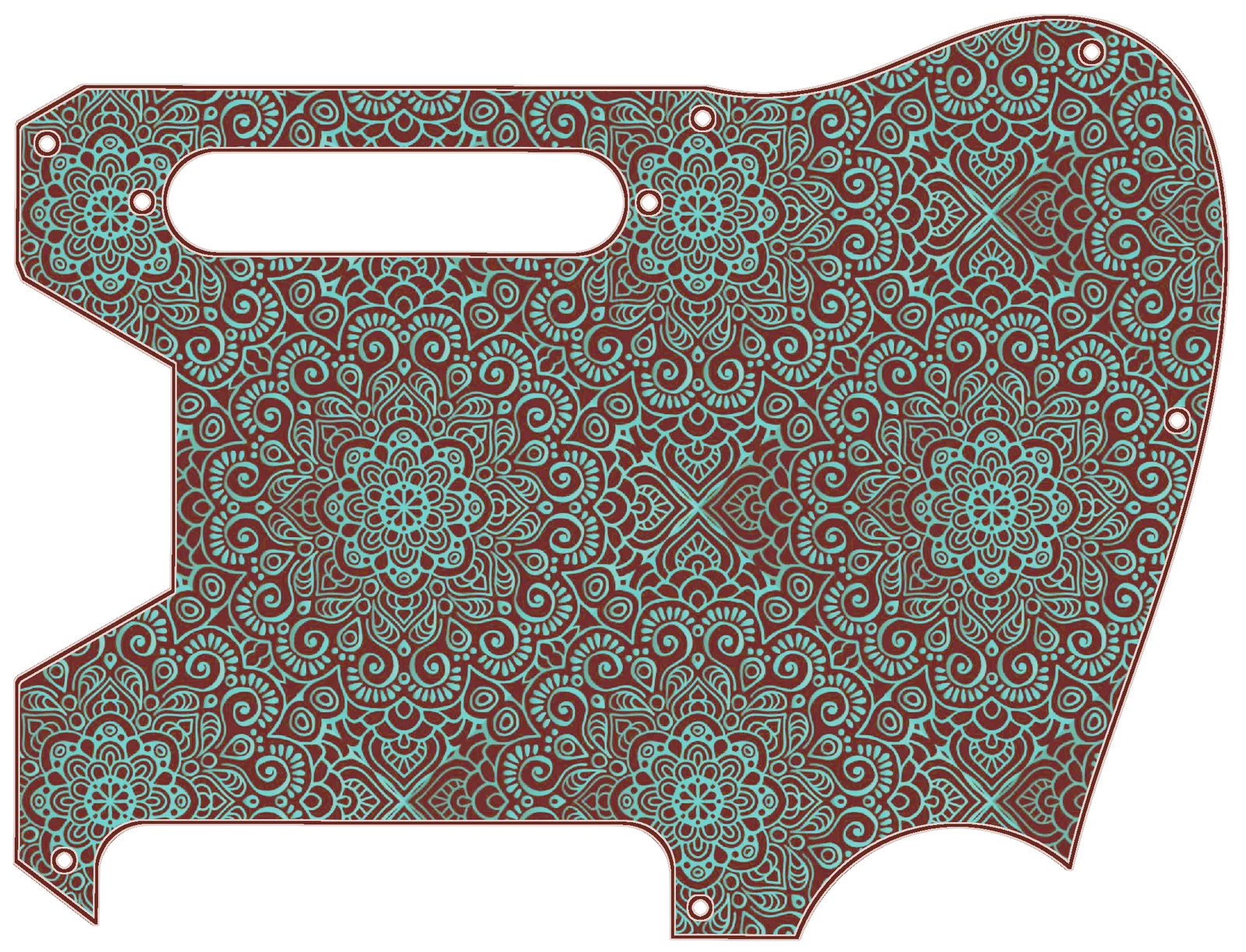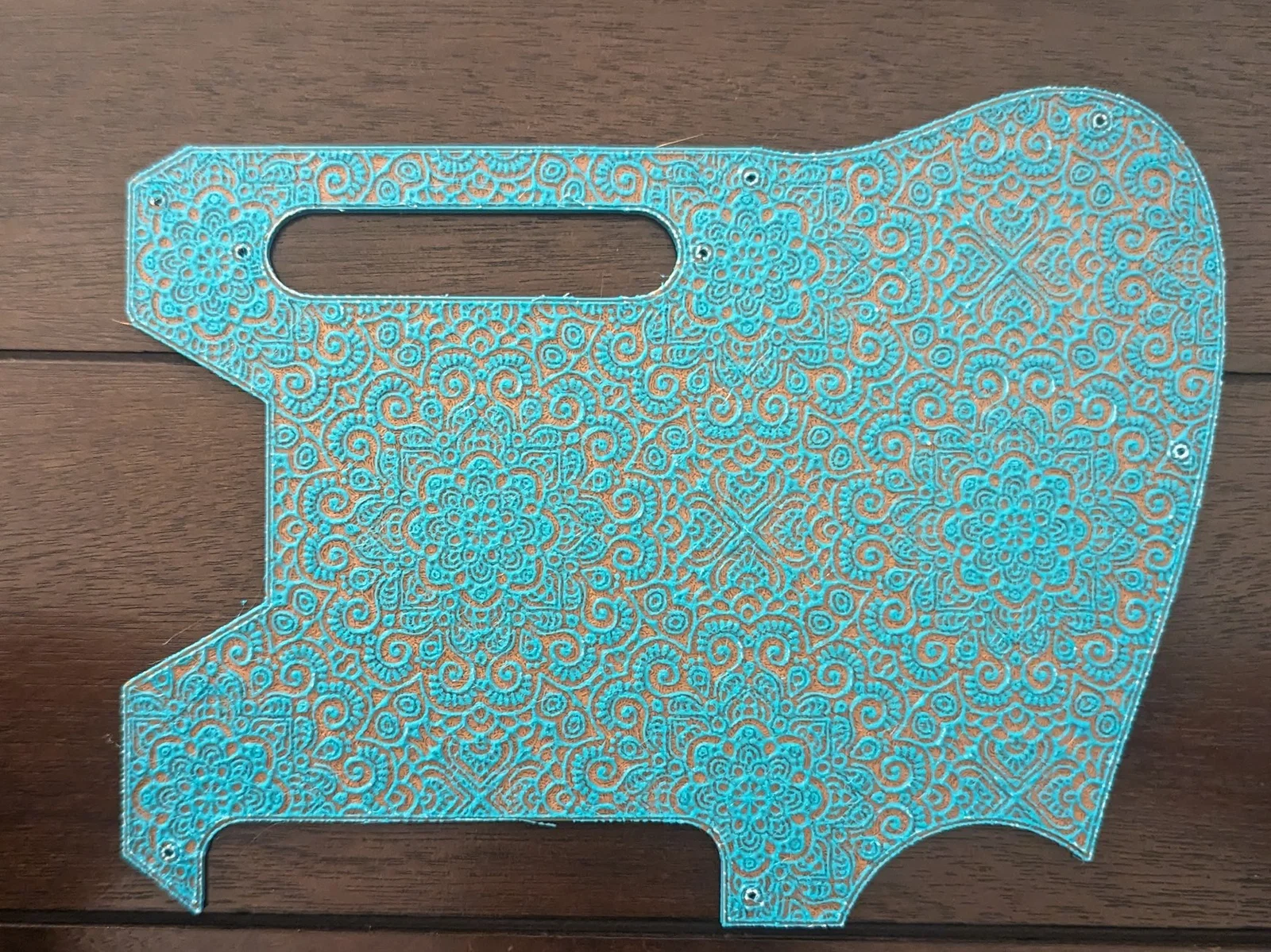 Pickguard Telecaster họa tiết mandala làm bằng HueForge cho Prusacaster. Kèm file pickguard_description.txt hướng dẫn thêm pause để đổi filament thủ công hoặc color swap cho máy multicolor, và gợi ý xem tutorial HueForge.