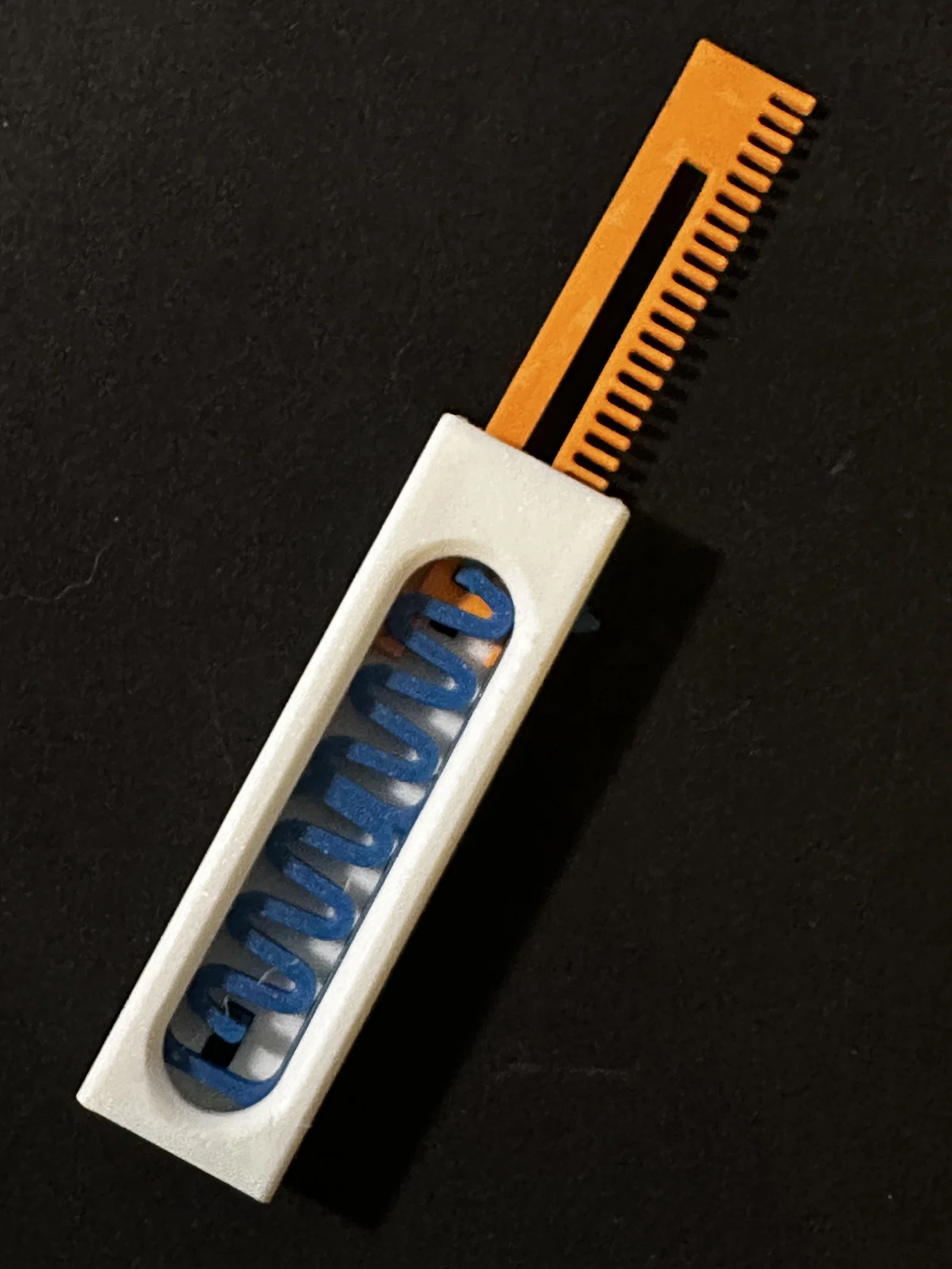 Vẫn là cơ chế compliant và các phần insert như cũ, nhưng phần case đã được chỉnh lại. Mình thêm một khớp dovetail lên phần đế gốc, kèm theo một cái cover giúp bạn cầm nắm tay cầm dễ hơn mà không bị đặt ngón tay lên lò xo, tránh làm hạn chế chuyển động của nó.