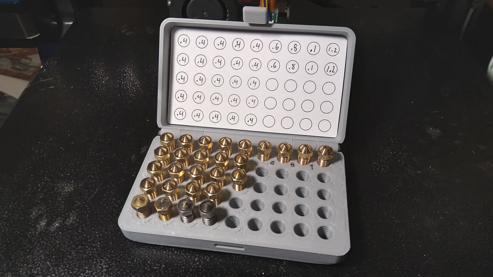 Đây là cái case để chứa tối đa 45 nozzle kiểu Volcano. Mình có vài phiên bản. Có 2 bản print in place: một bản có ghi size nozzle và một bản không ghi. Bản có ghi size thì nhìn không rõ lắm, sẽ hợp hơn nếu in bằng Resin.