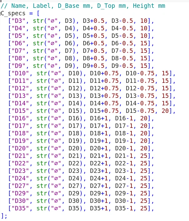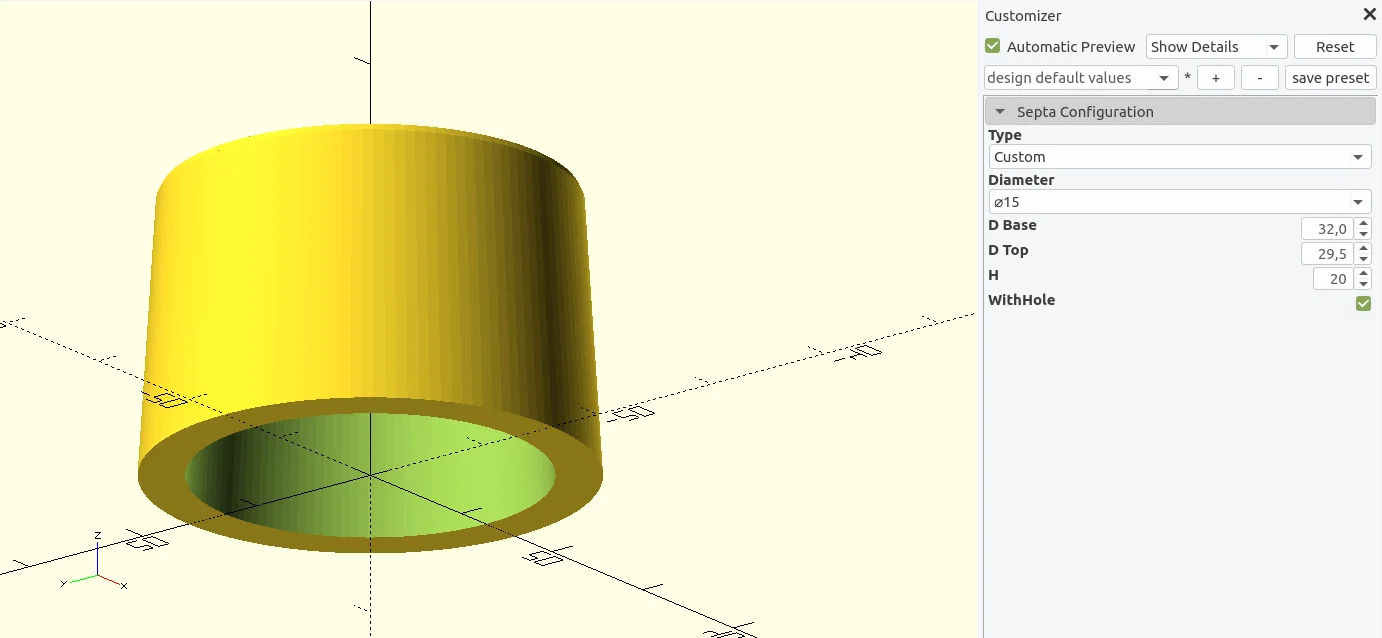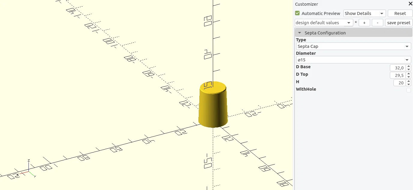 Trong này có một bảng để tạo septa đường kính từ 3 đến 35mm, và tuỳ chọn tạo septa custom bằng cách nhập đường kính phía dưới và phía trên. Ngoài ra còn có tuỳ chọn thêm lỗ trên nút (plug) để kín hơn và dùng ít vật liệu hơn.