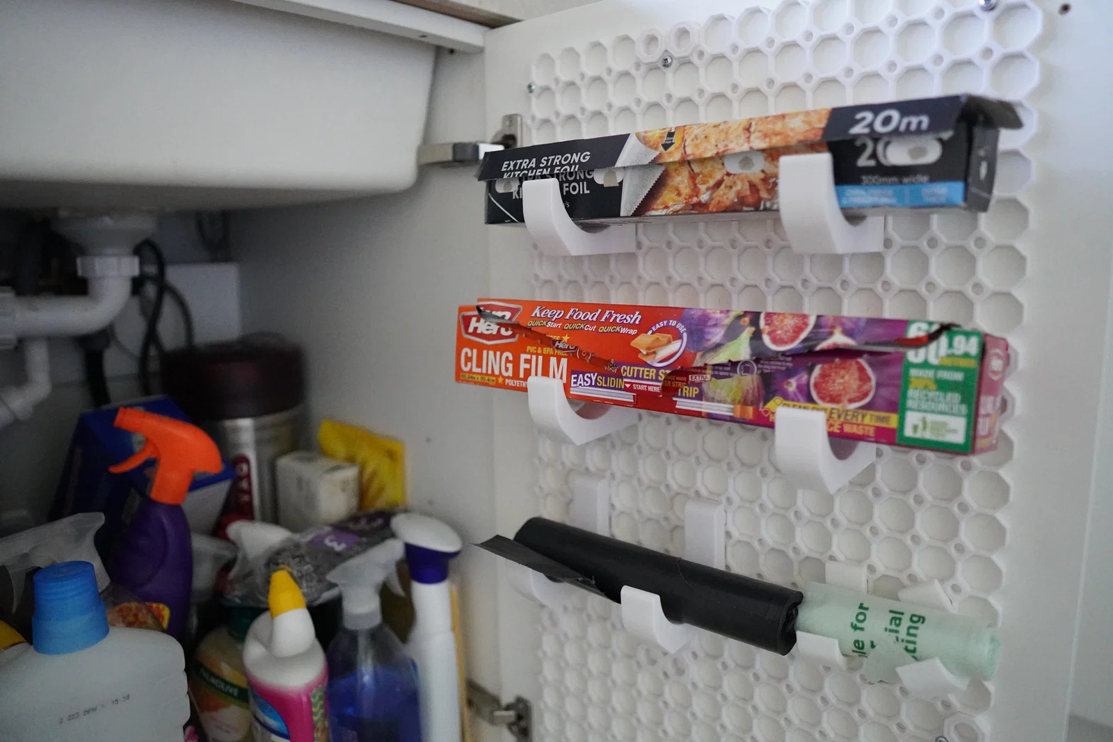 Bộ móc treo đa dụng cho Multiboard với nhiều size, dùng khắp nhà: treo cuộn Cricut vinyl, giấy gói, túi rác, tuýp silicone/caulk, màng bọc và giấy bạc. Trượt vào MultiConnect, nên dùng 2 cái cho chắc.
