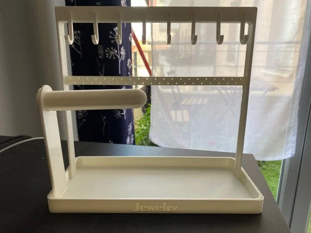 Giá treo trang sức (Jewelry Holder) dạng stand gồm nhiều bộ phận để trưng bày và cất gọn nhẫn, dây chuyền, bông tai và vòng tay. Có thể cần gọt nhẹ mép lỗ và dùng super glue để lắp ráp.