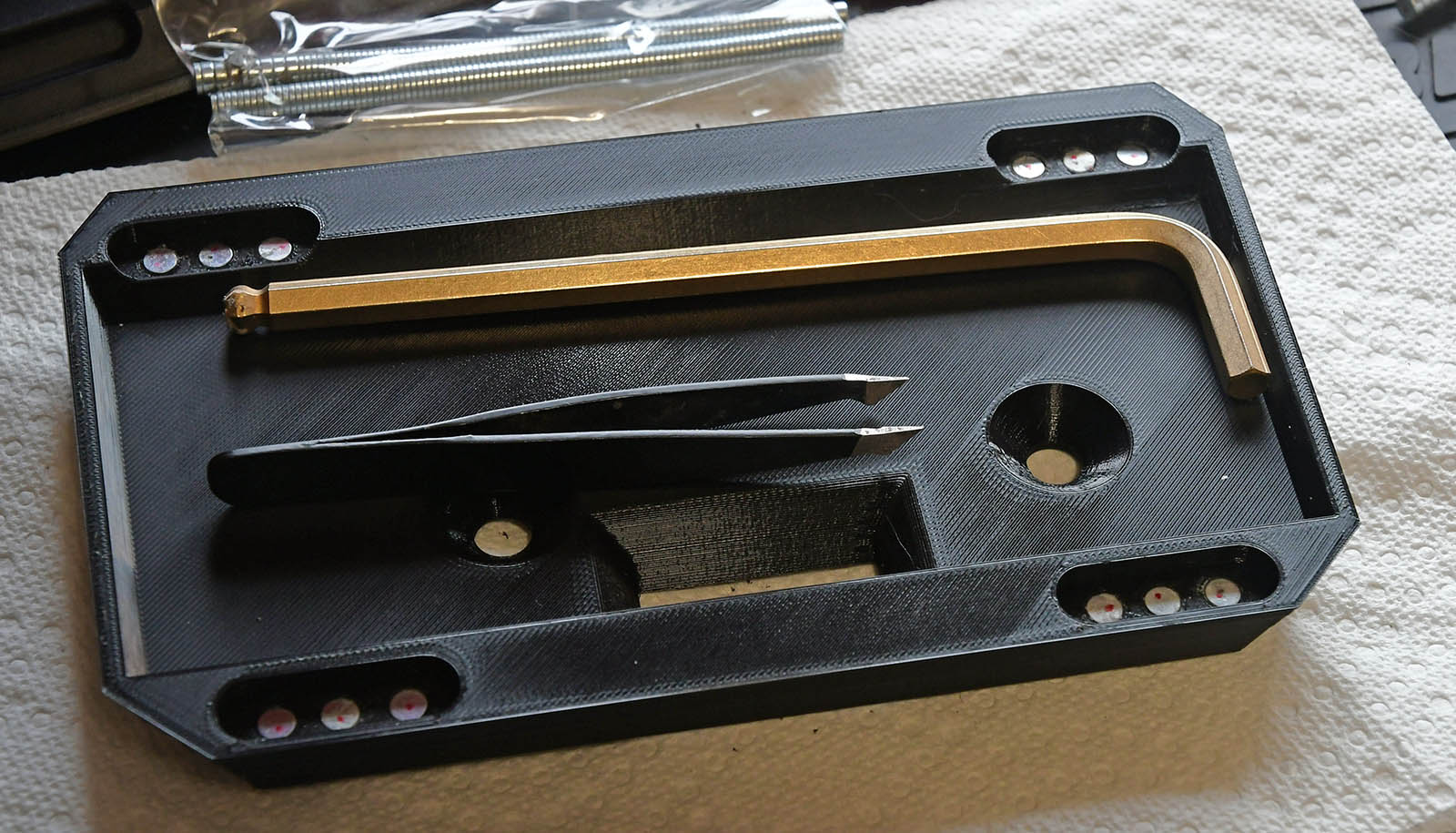 Có các lỗ để gắn nam châm neodymium 5x2mm, mình dùng keo 502 (super glue) để dán cố định. Nhớ kiểm tra đúng cực (polarity) khớp với mặt dưới của StreamDeck trước khi dán nam châm. Lúc lắp mình chấm một dấu đỏ để đánh dấu phía “up”. Bạn sẽ phải dán từng viên một và chờ keo khô hẳn để nam châm không hút kéo dính vào nhau.