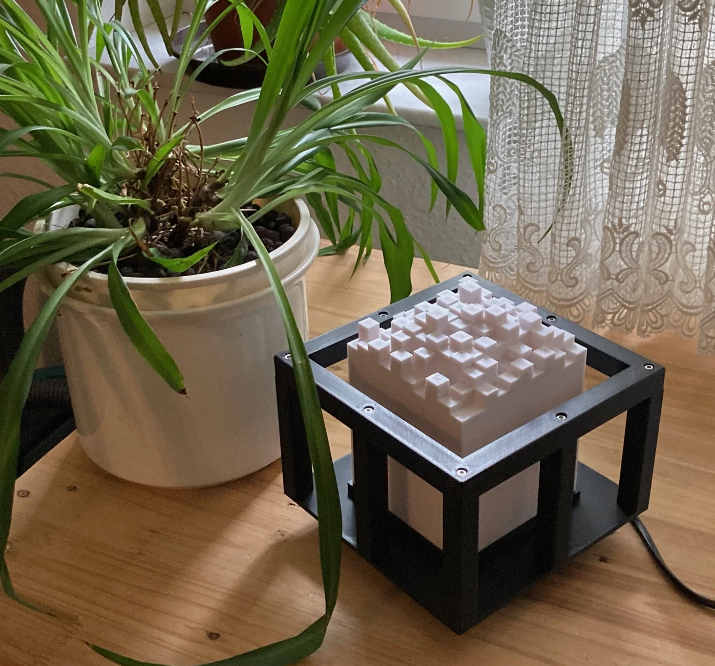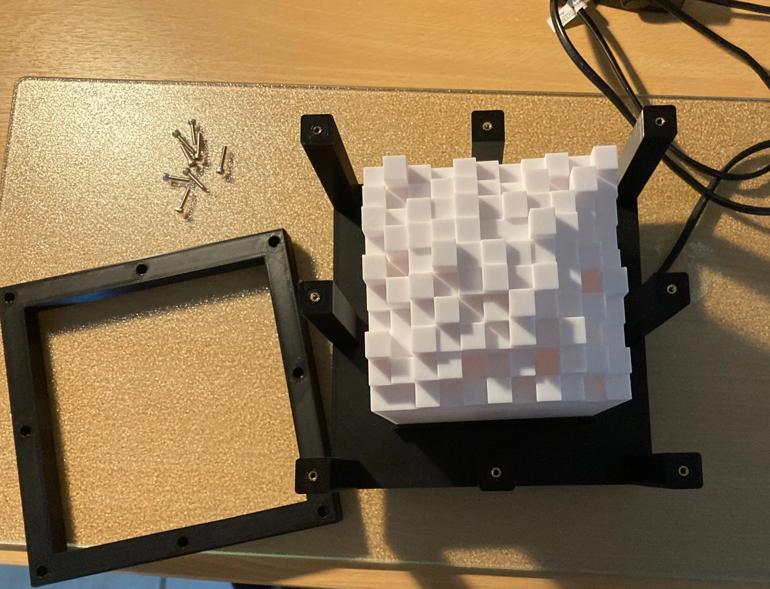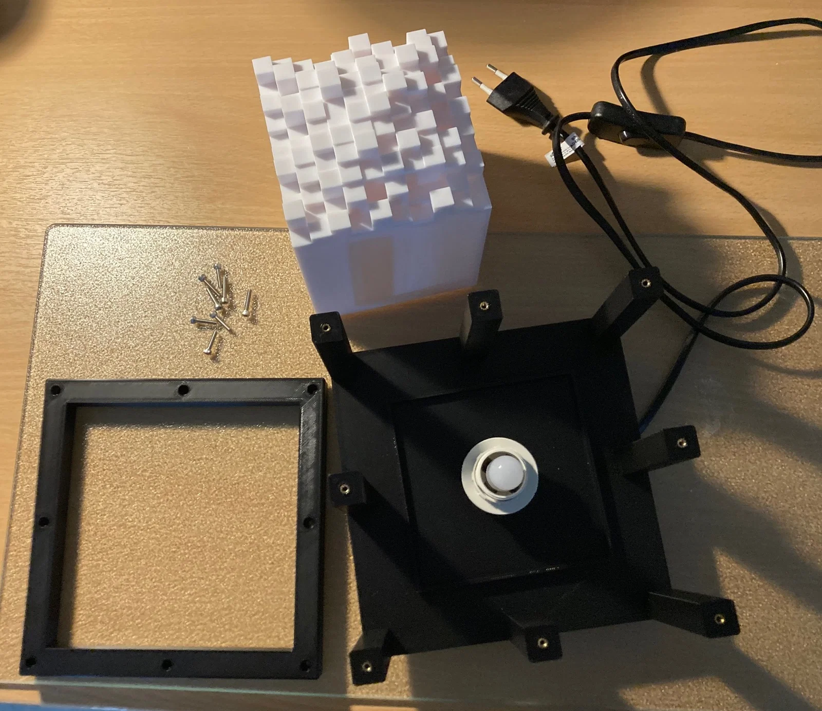 Mẫu Lamp #24 - CityScape là đèn khung lập phương free-form kiểu xưởng cũ, tạo hiệu ứng cityscape trừu tượng. Kích thước 185×150 mm, cần in các vách/đế/nắp, dùng insert M3 và vít M3 để lắp ráp.