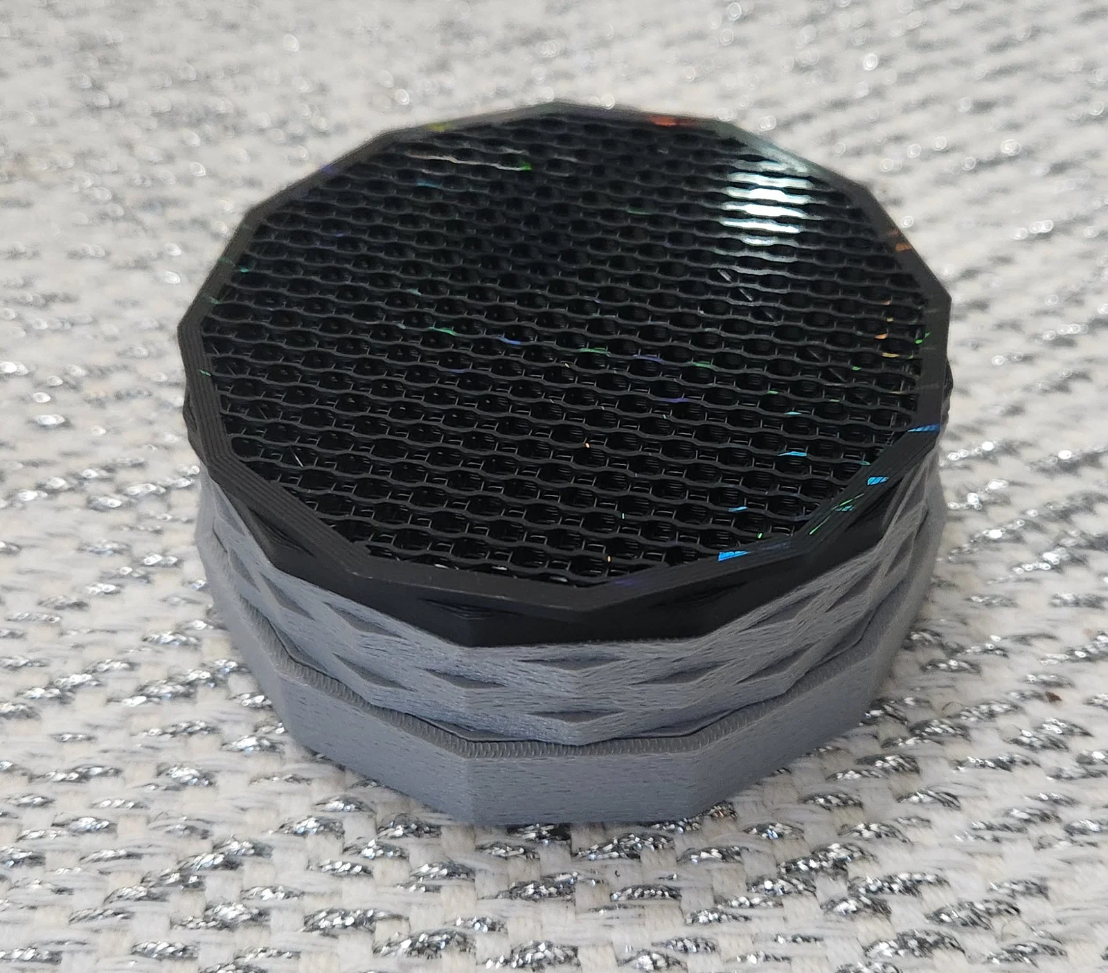 Nếu bạn muốn cái nắp nhìn giống cái màu đen trong hình của mình, thì in nó không có bottom layers, infill 25% 3D Honeycomb (hoặc kiểu nào bạn thích), 8 top layers, và nhớ dùng brim đủ lớn hoặc keo dán vì chi tiết này có thể bị warp nhẹ lúc in top layers do phía dưới không có lớp đáy.
