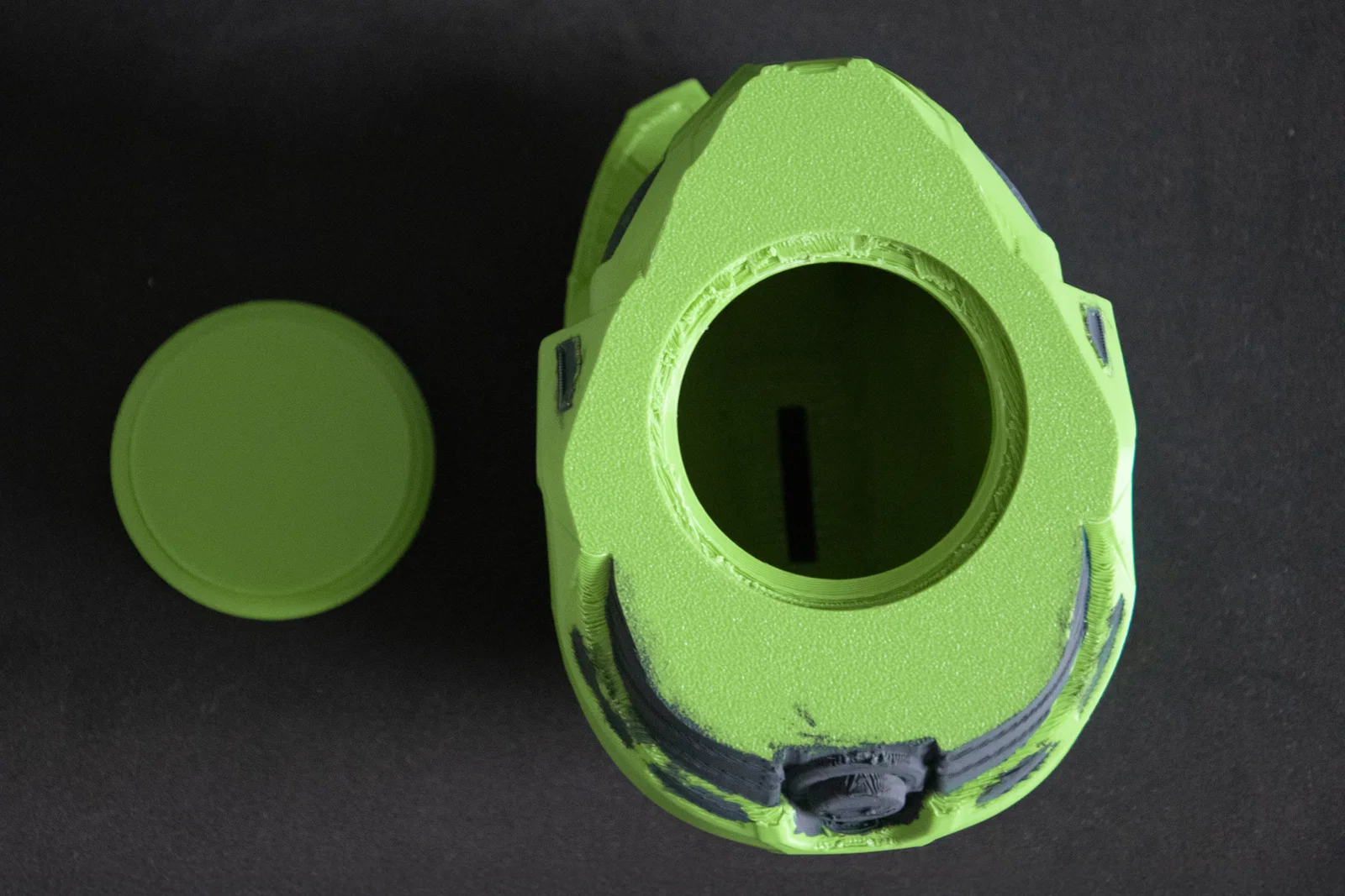 Đây là mẫu heo đất (ống tiết kiệm) mô phỏng chiếc mũ bảo hiểm của Master Chief trong tựa game Halo. Mẫu này được thiết kế để in 3D hoàn toàn và có thể đóng mở dễ dàng nhờ cơ chế chốt vặn.