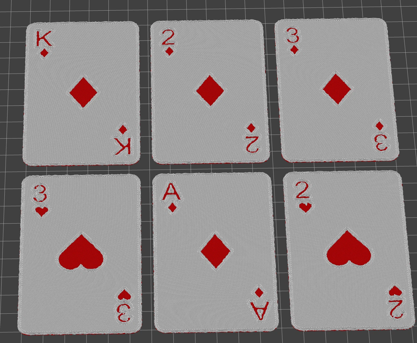 Bộ Hueforge Playing Cards là bộ bài tây đầy đủ có thể in trên máy in 1 màu. File được chia theo từng màu; gợi ý thông số: layer height 0.08mm, first layer 0.16mm, infill 100%, đổi màu ở lớp thứ 6.