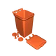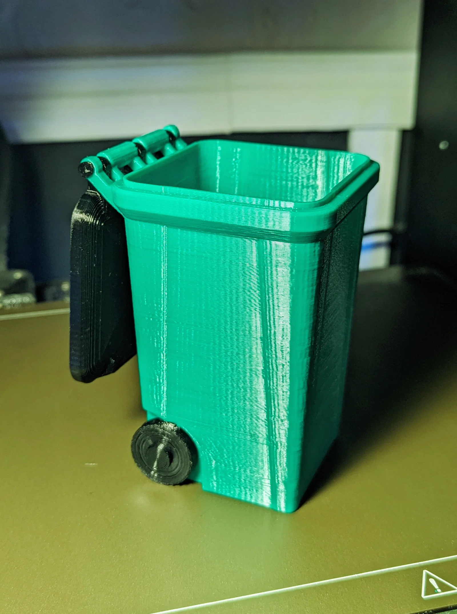 Thùng rác mini dạng functional có bánh xe và nắp đậy. Không cần supports, dễ in với đa số thiết lập. Có file STL cho bản in một màu và nhiều màu, dùng đoạn filament làm chốt bản lề nắp.