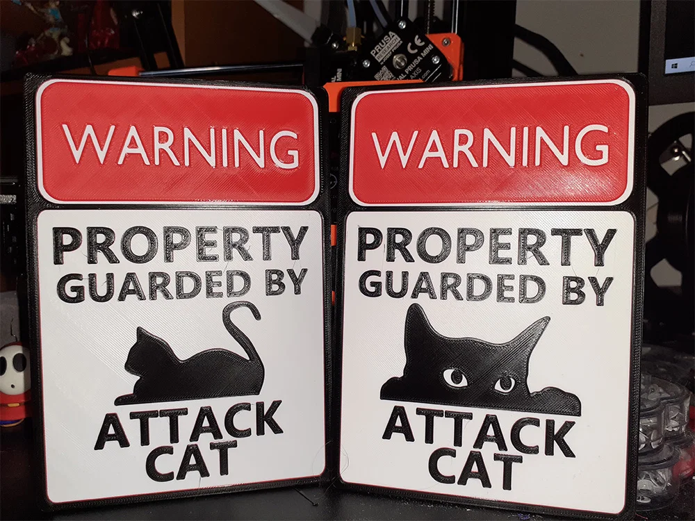 Bộ 3 biển cảnh báo vui nhộn cho nhà có mèo, nhắc mọi người coi chừng “móng vuốt” bất ngờ. Gợi ý in nhiều màu theo lớp White → Red → Black, kèm mốc đổi màu cho PrusaSlicer (0.2 mm).