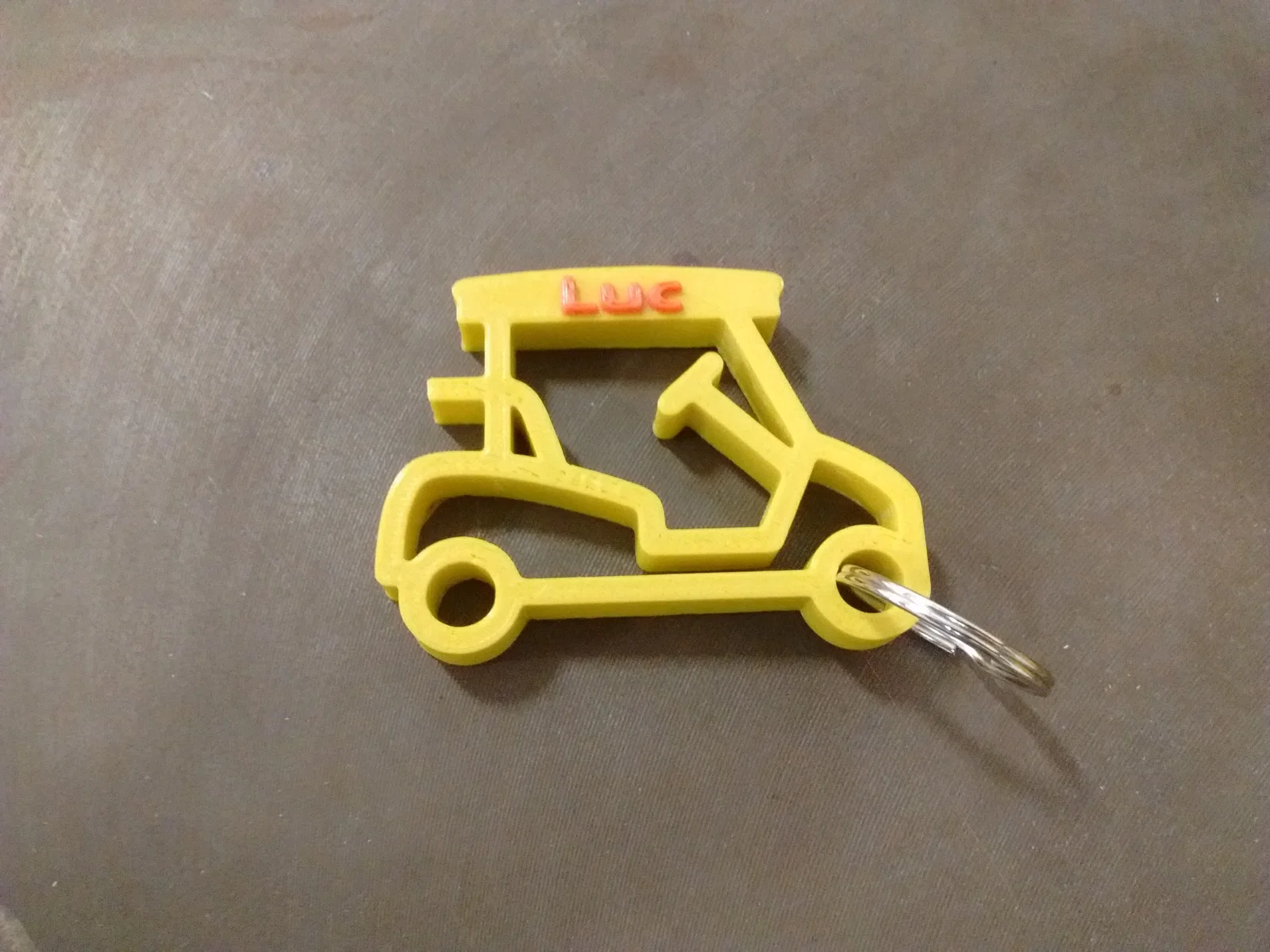 Mẫu móc khóa xe golf “Luc” làm tặng một người bạn ở ESMB. Thiết kế từ icon Icons8, chuyển bitmap sang SVG bằng Inkscape, rồi dùng OpenSCAD xuất STL; phần mái được chỉnh để thêm chữ bằng TinkerCAD.