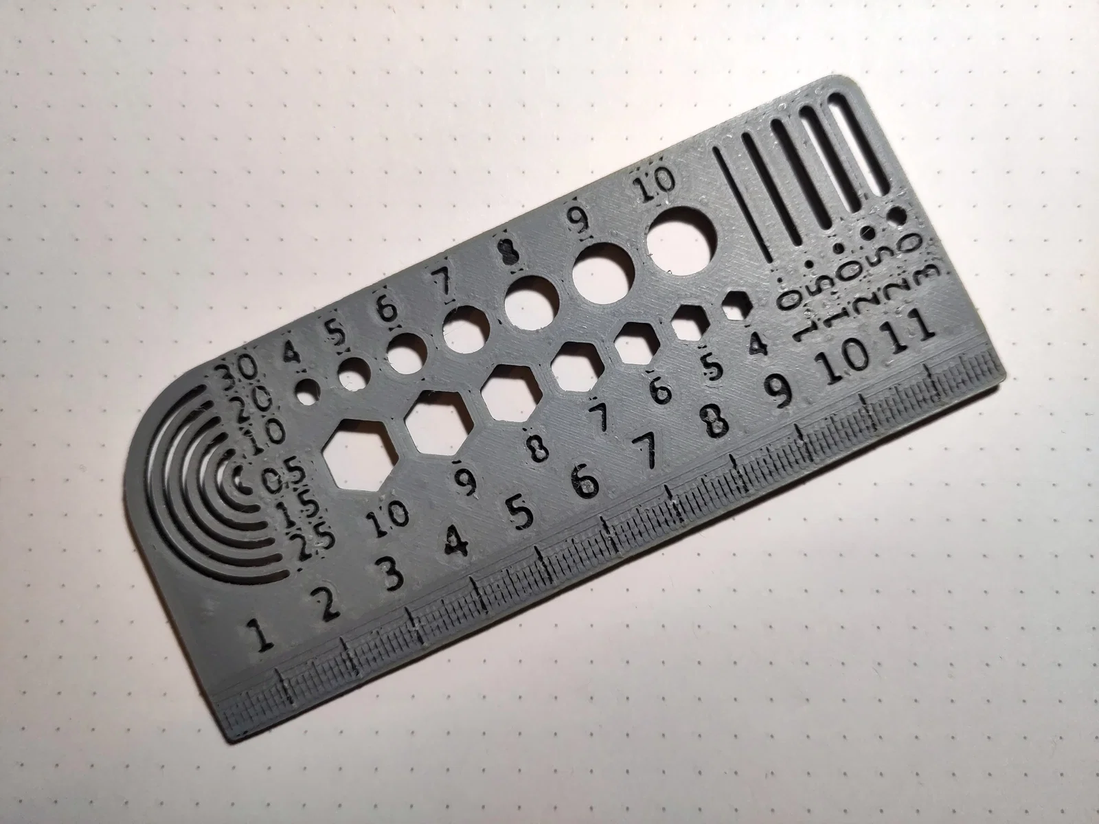 Thước 120mm đa năng có lỗ gauge 1–10 mm, lỗ lục giác, các khe và mẫu cung tròn. Khuyến nghị in nozzle 0.4mm hoặc nhỏ hơn và đổi màu sau lớp 1.2mm; có thể cần khoan/doa lại lỗ để chuẩn hơn.