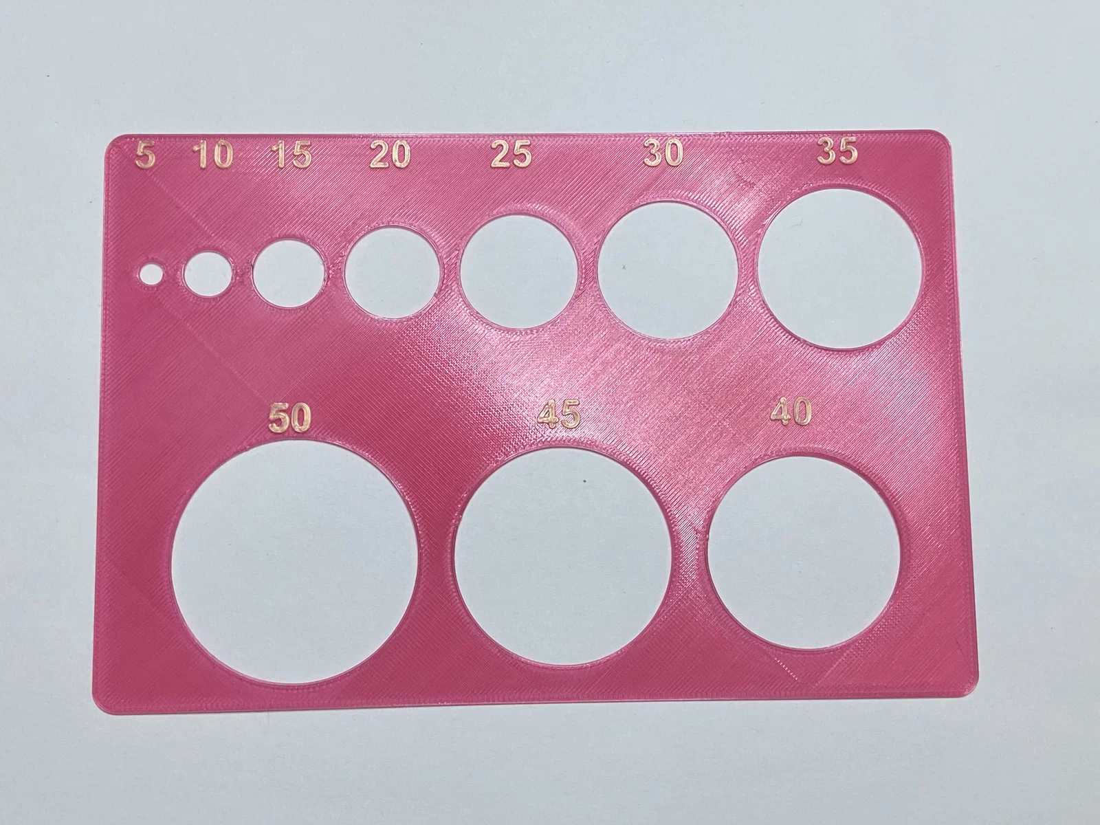 Mẫu Simple Circle Stencil gồm nhiều kích thước đường kính: 5, 10, 15, 20, 25, 30, 35, 40, 45, 50mm. Phù hợp làm khuôn canh/đánh dấu nhanh để vẽ hoặc khoanh tròn chính xác, dễ in 3D.