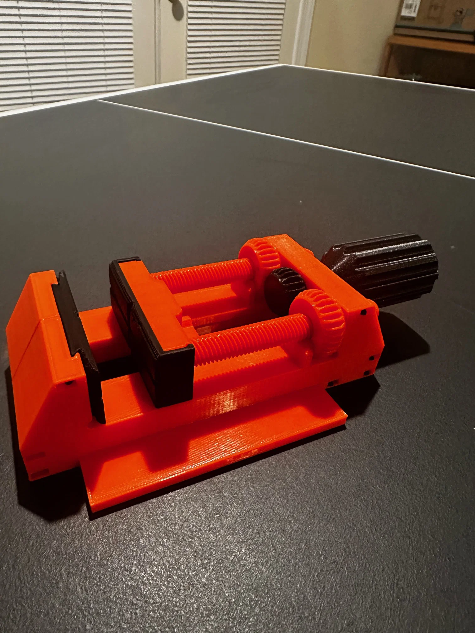 Cơ chế hoạt động của ê-tô này dựa trên hệ thống bánh răng và trục vít, cho phép bác đóng mở ngàm kẹp cực nhanh chóng mà không cần phải xoay tay cầm quá nhiều vòng. Thiết kế này đặc biệt phù hợp cho những ai cần sự tiện lợi và tốc độ khi liên tục chuyển đổi giữa các vật cần gia công. Với các chi tiết được in 3D sắc sảo, sản phẩm không chỉ là một công cụ hỗ trợ đắc lực mà còn là món phụ kiện cực "chất" cho góc làm việc của bác.