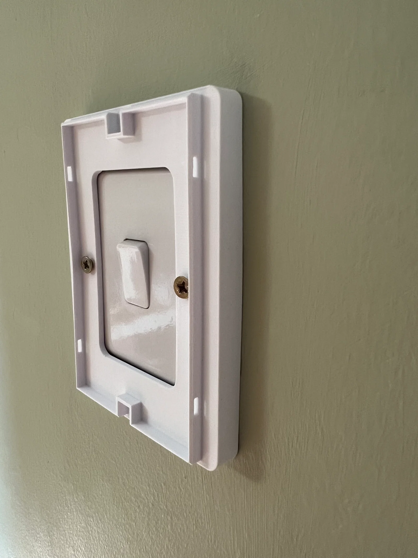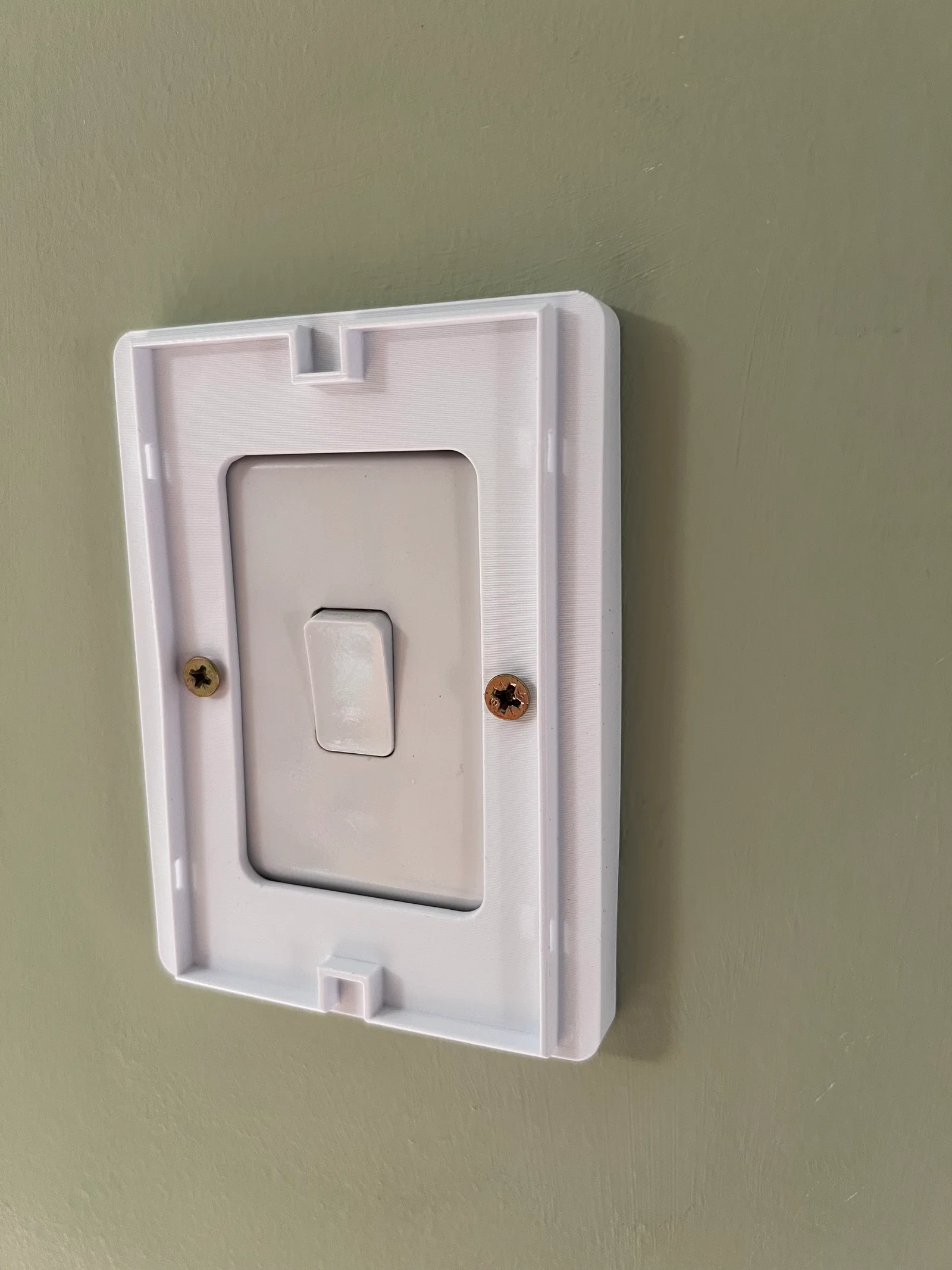 Miếng cover này dành cho Hue Dimmer V2 và dùng lại phần face plate của bộ giá đỡ nam châm (magnetic holder) đi kèm với remote. Nó ôm quanh công tắc đèn chuẩn UK loại 1-gang (1-Switch) và tận dụng luôn lỗ bắt vít sẵn của công tắc, nên không cần băng keo dán hay khoan đục tường!