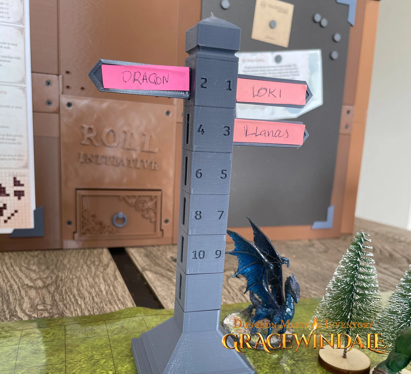 Initiative Tracker - Post là mẫu promo cho Kickstarter Dungeon Master's Inventory. Dán giấy lên mũi tên để ghi tên nhân vật, rồi sắp xếp lại thứ tự initiative khi chơi TTRPG. In FDM/resin dễ, thường không cần supports.