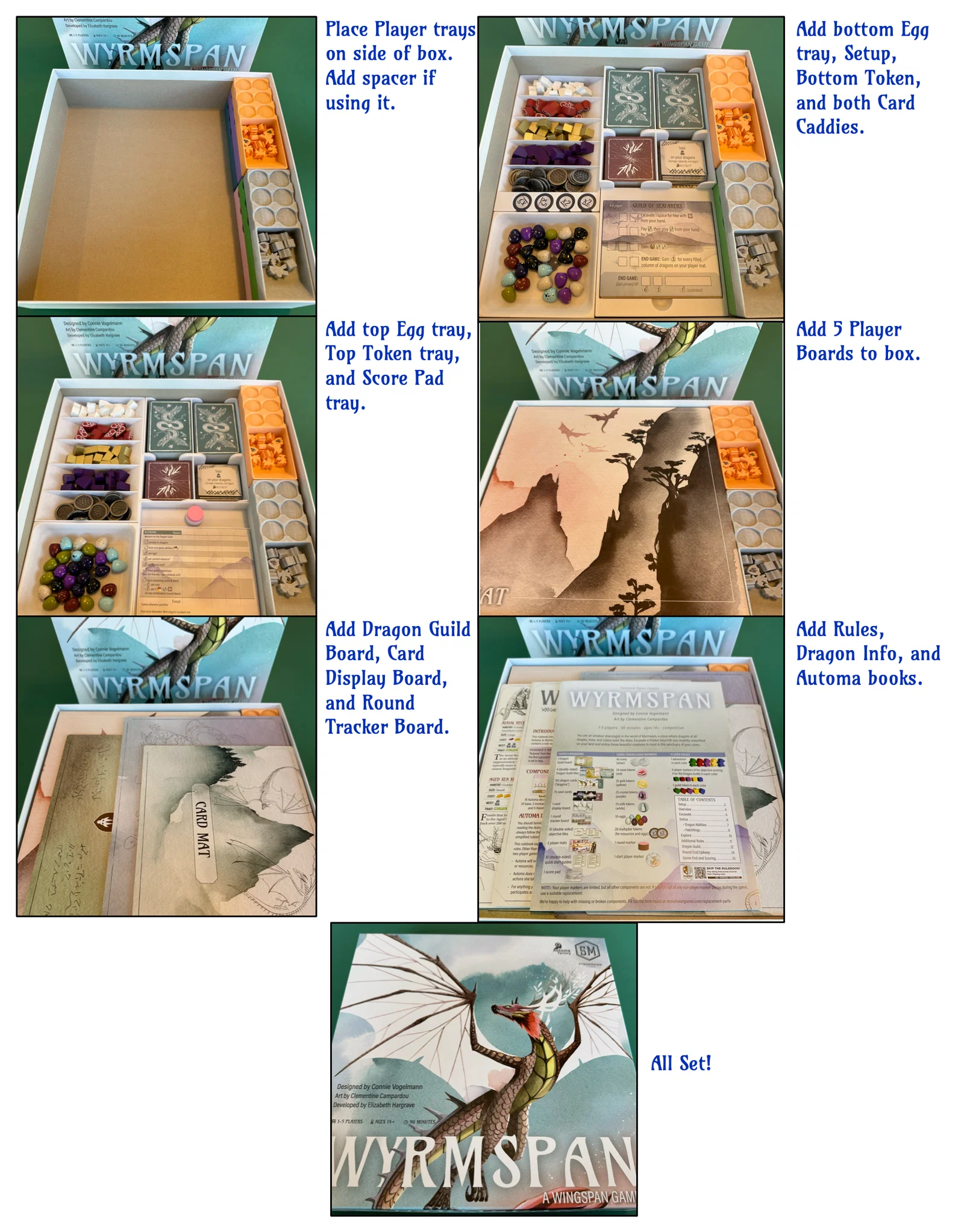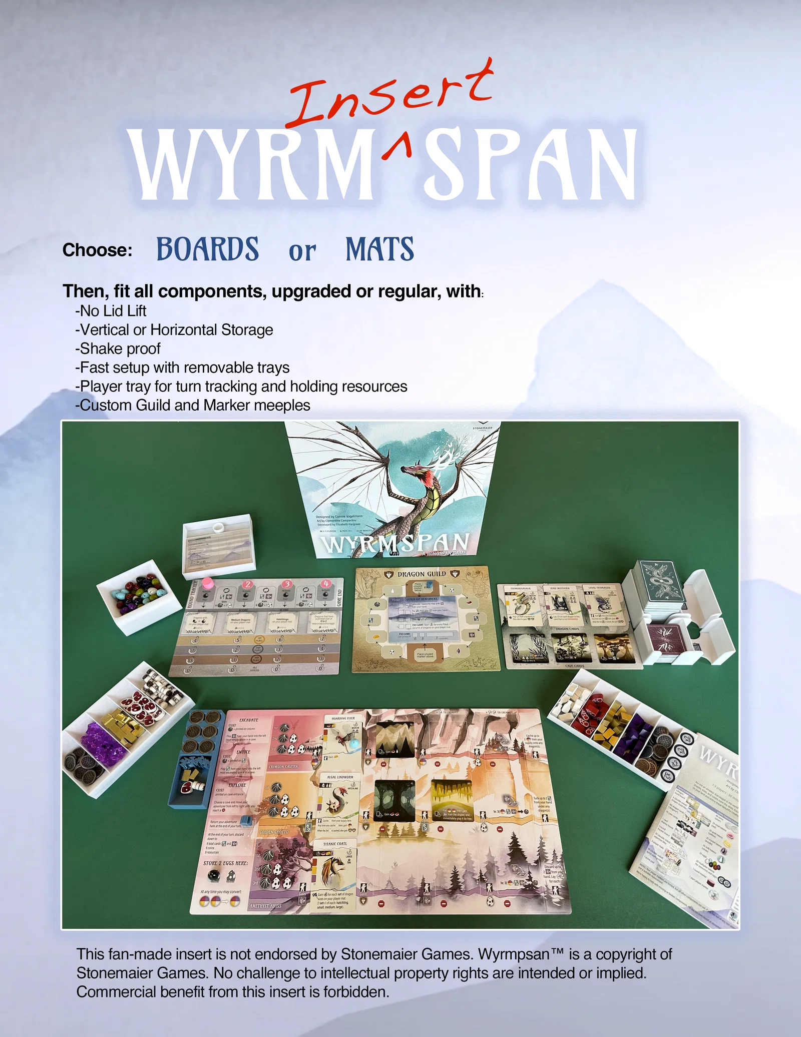 Đây là bộ khay đựng chống rung cho game Wyrmspan, hỗ trợ cả bản dùng bọc bài (sleeved) lẫn không bọc. Thiết kế tối ưu để chứa token, thẻ bài và các tấm lót (mat) từ Stonemaier Games mà không làm kênh nắp hộp.