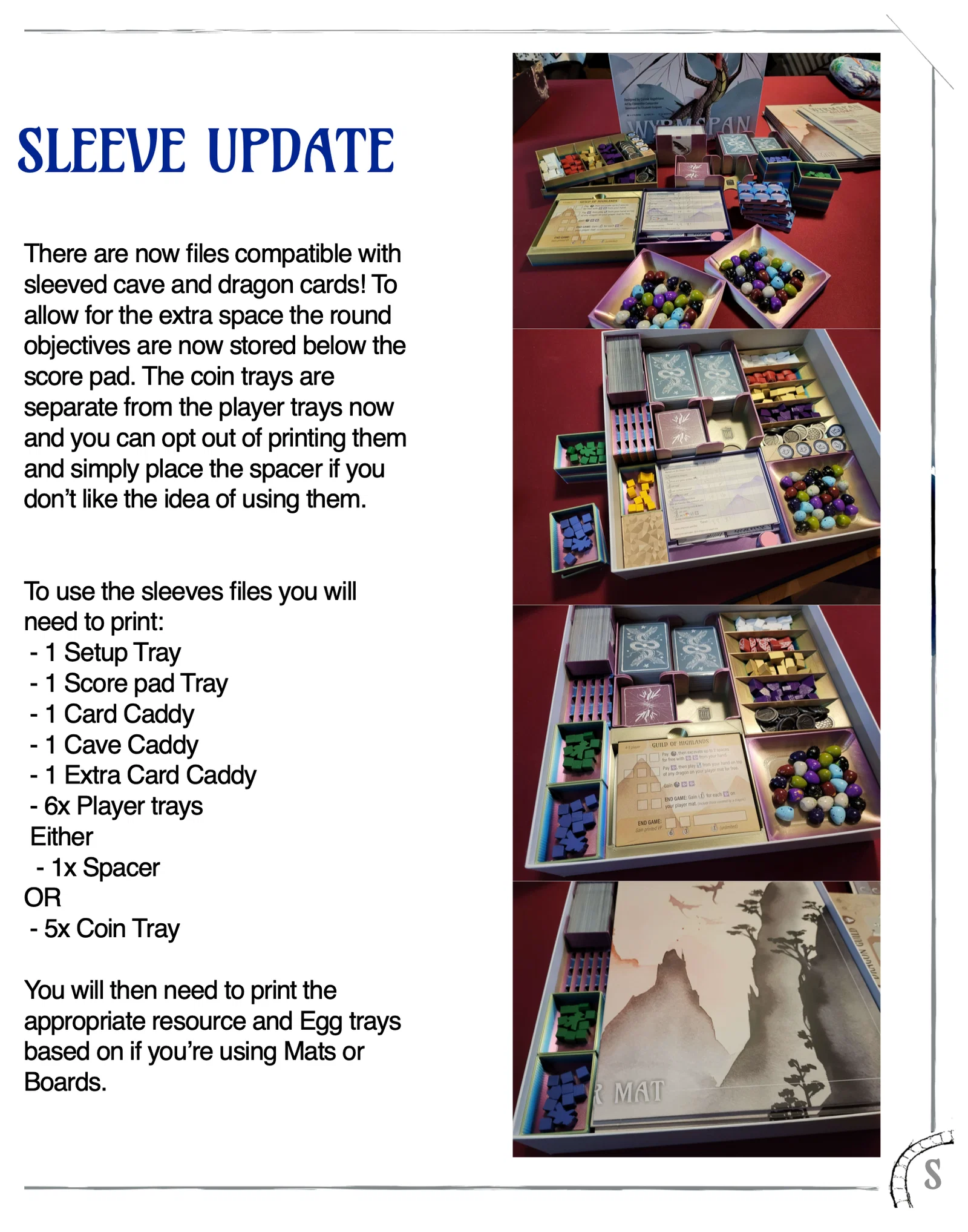 Cho phiên bản không dùng bọc bài: 1x Extra card caddy sleeved.stl 1x Dragon Academy Setup.stl 1x Objective Tile Holder.stl 2x Single Player Holder.stl 1x Vertical Player Holder.stl 1x Top Double Player Holder.stl 5x Coin Tray Sleeved.stl 1x Fledgling Holder.stl