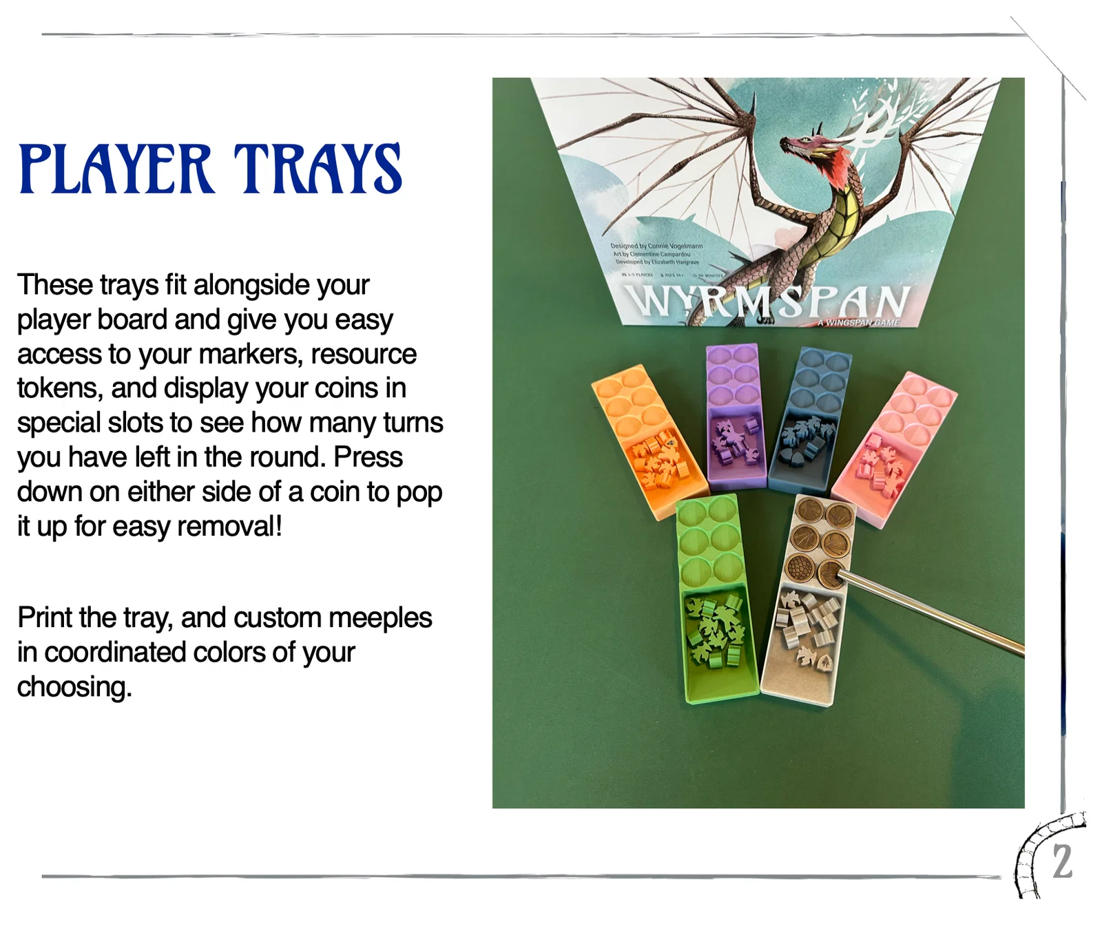 Bộ mô hình này tạo thành một khay insert chống rung cho game Wyrmspan mới. Thiết kế này hỗ trợ token cơ bản trong hộp, token cao cấp từ Stonemaier Games hoặc token nhựa từ Top Shelf Gamer. Với việc chọn khay đựng token phù hợp, bạn có thể cất giữ bảng chơi gốc hoặc 5 tấm lót cao su từ Stonemaier Games mà không làm nắp hộp bị kênh!