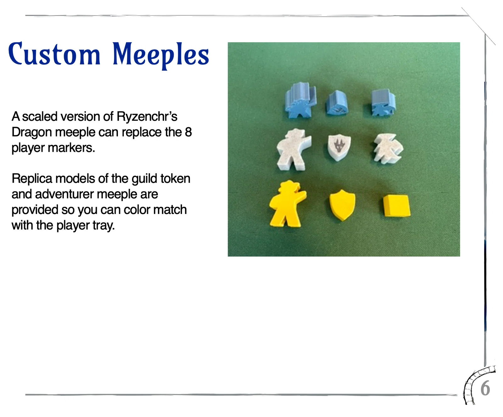 Ngoài insert, mình còn đính kèm các file remix để thay thế khối đánh dấu bằng hình rồng nhỏ, meeple bang hội rồng và bản sao của meeple thám hiểm. Như vậy, hộp người chơi, khối rồng và dấu mốc bang hội của bạn sẽ đồng màu mà không cần mất công chọn màu PLA để khớp với các meeple có sẵn.