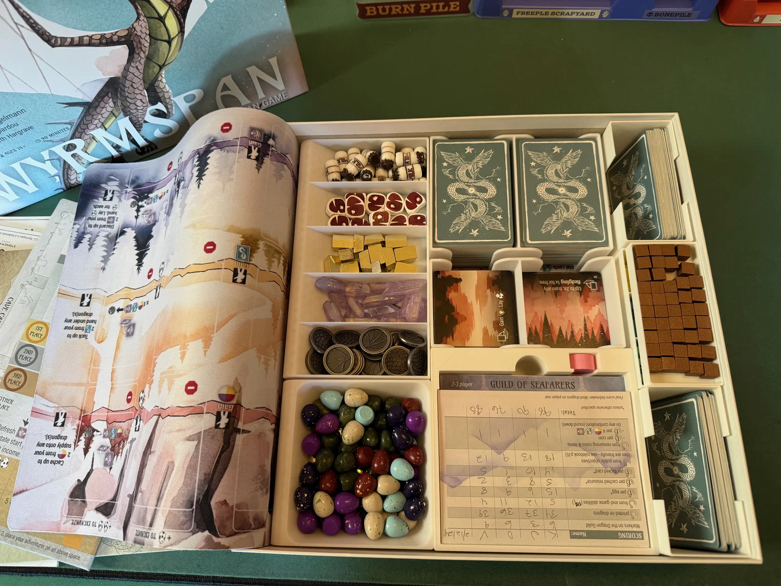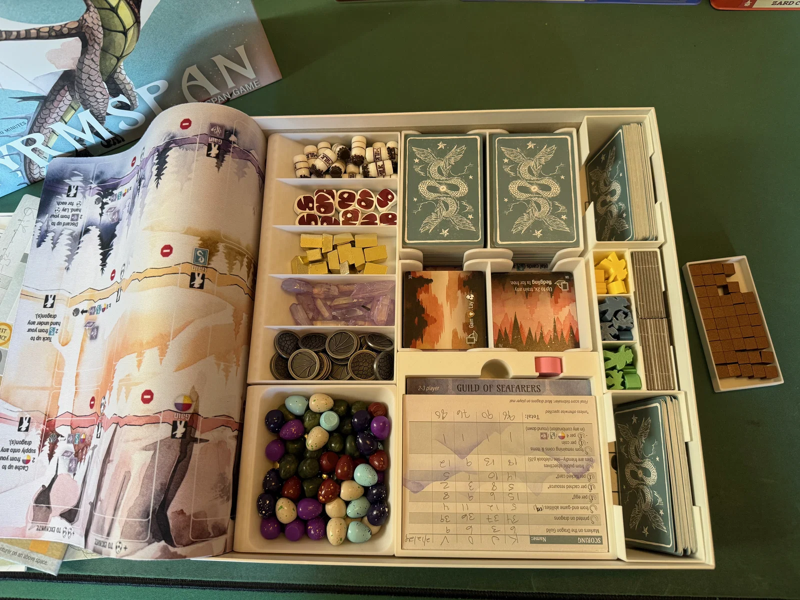 Cập nhật 22/10/2025 Mình đã làm các file mới để chứa thẻ Dragon Academy, token và các linh kiện khác. Do phải tích hợp các yếu tố mới từ bản mở rộng, một số phụ kiện ở bản insert gốc đã được loại bỏ để tiết kiệm diện tích. Mình cố gắng tối ưu hóa để tận dụng lại các khay đựng tài nguyên, thẻ, trứng và hang động.