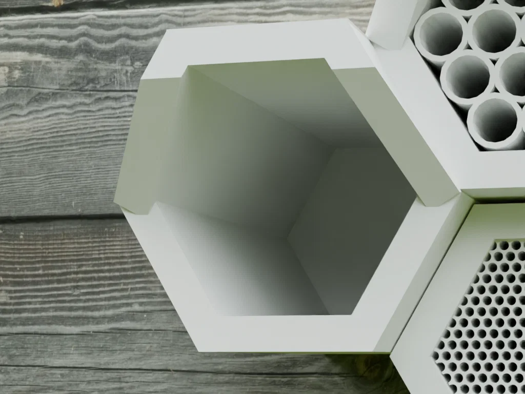 HexaHive dạng module rộng 10 cm, khách sạn côn trùng hình lục giác giúp tăng đa dạng sinh học cho vườn/ngoài trời. Có bản rỗng (empty). Khuyến nghị in holders không fill, in links riêng để dán; dùng PETG/ABS/ASA.
