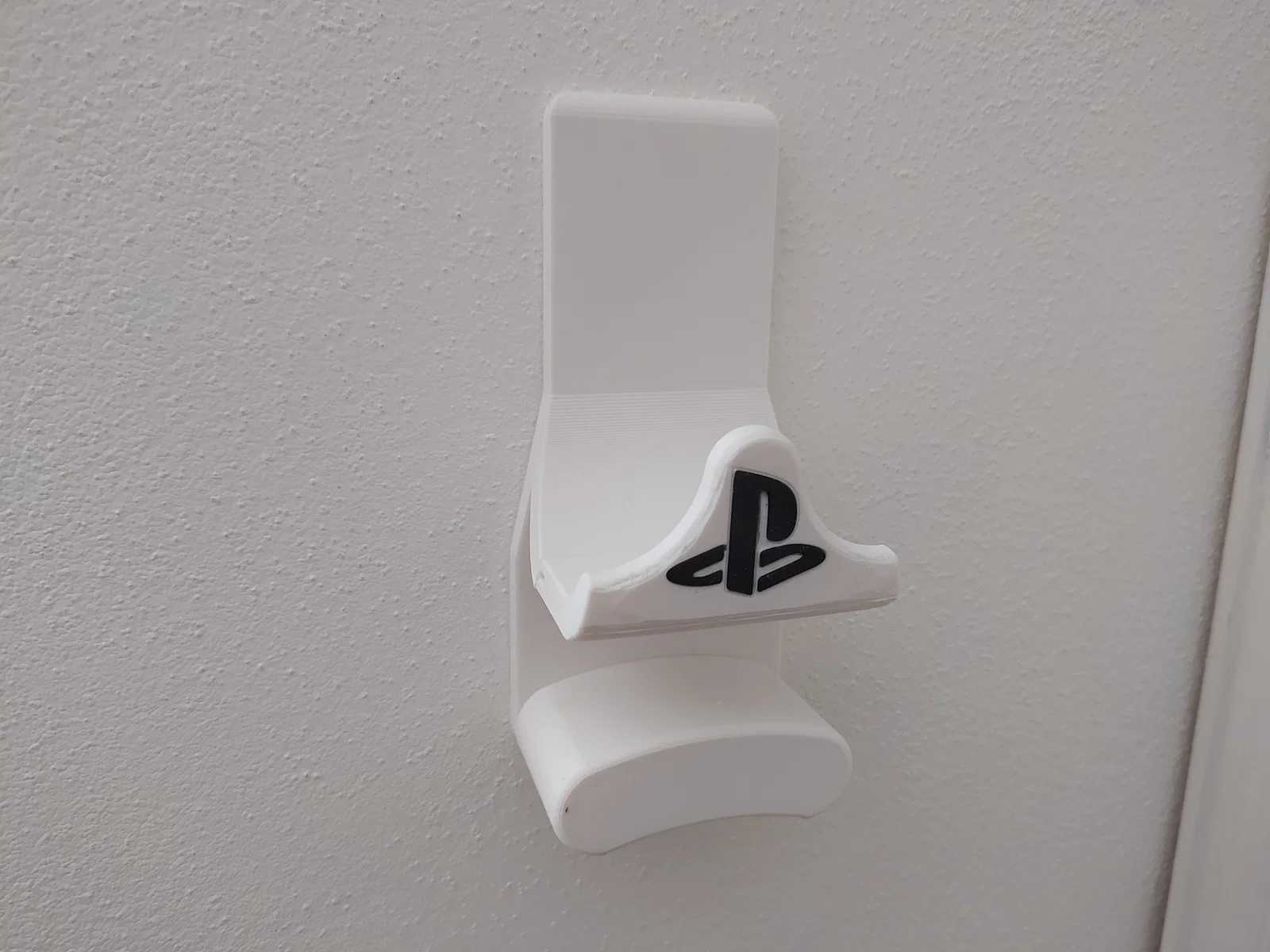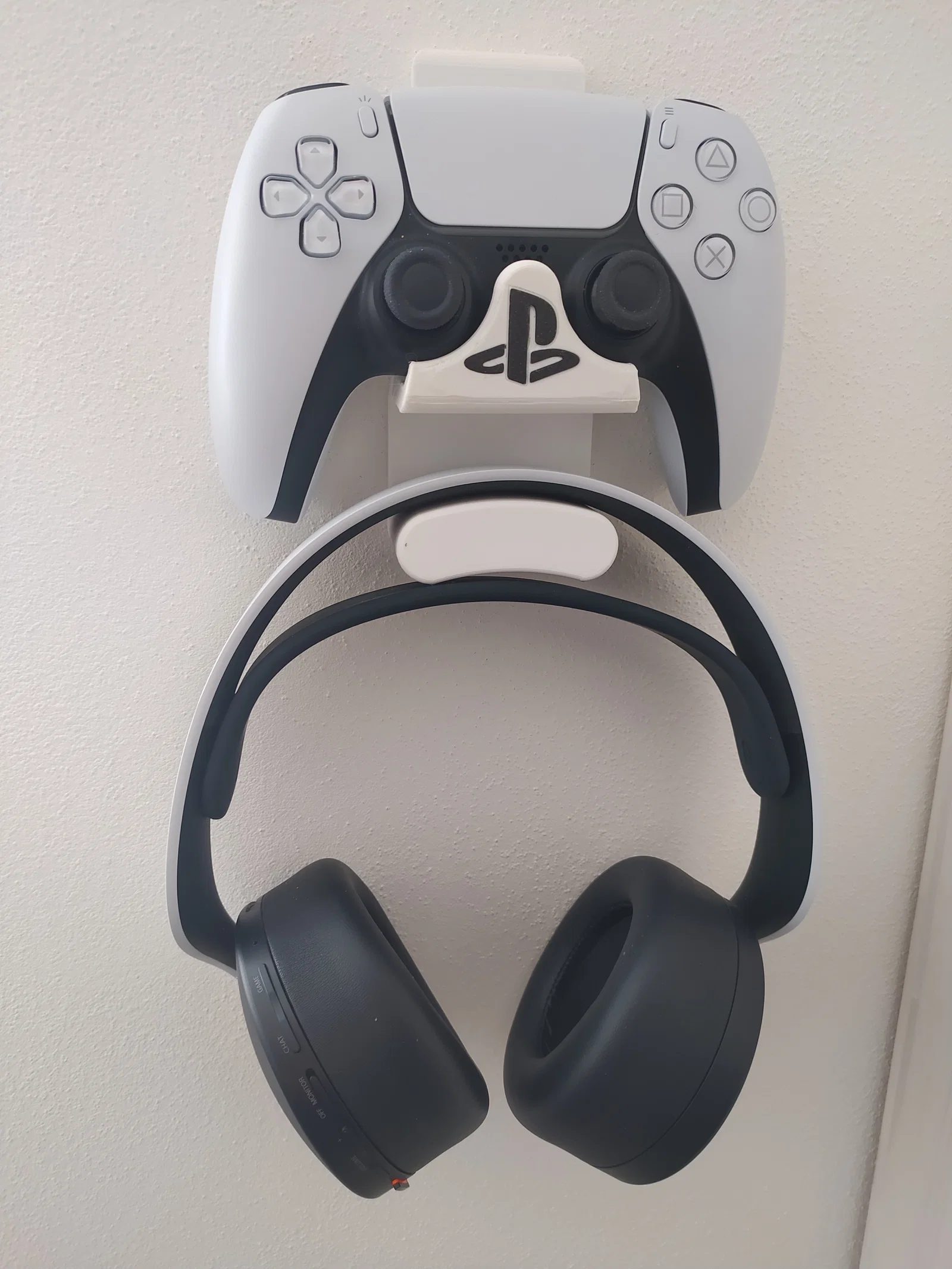 Giá treo tường đơn giản cho tay cầm PS5 chính hãng và tai nghe. In bằng PETG (ví dụ Prusament PETG), dán các phần bằng superglue và gắn lên tường bằng Mamut Glue hoặc keo 1 thành phần tương tự.