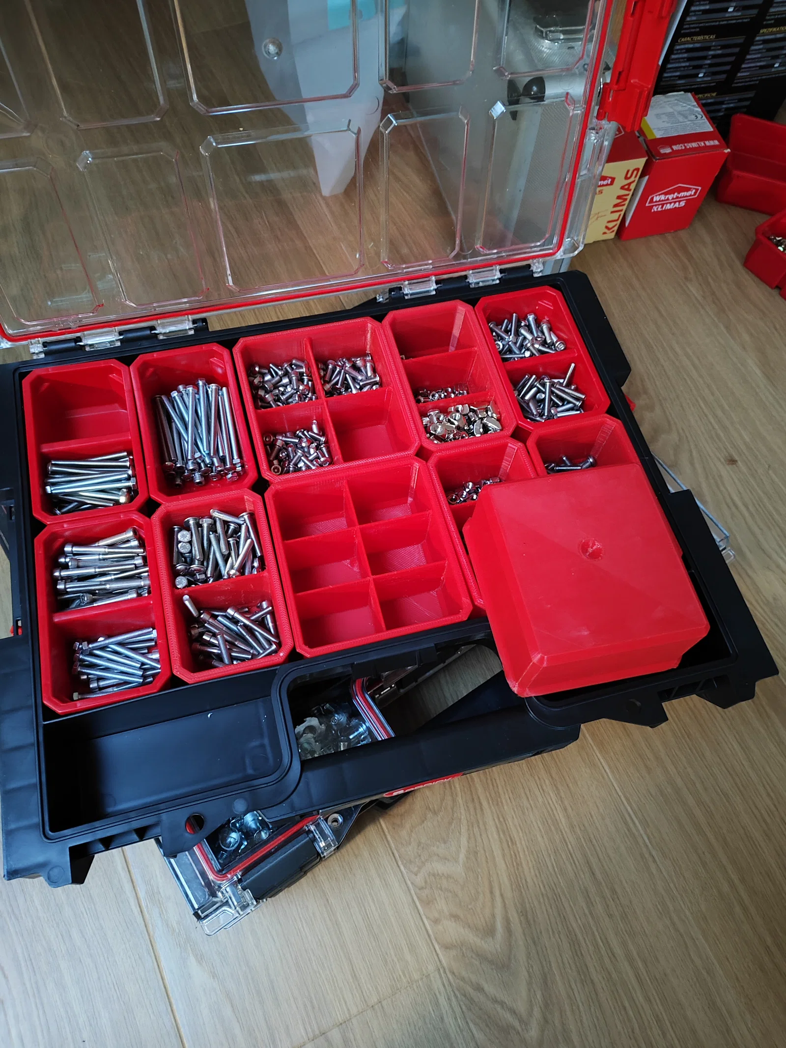 Bộ bucket parametric cho ngăn kéo và organizer Qbrick, cho phép tùy biến kích thước, số ô/cột bên trong, độ dày vách theo nozzle, mép trên và chiều cao (mặc định 53mm), kèm tùy chọn notch.