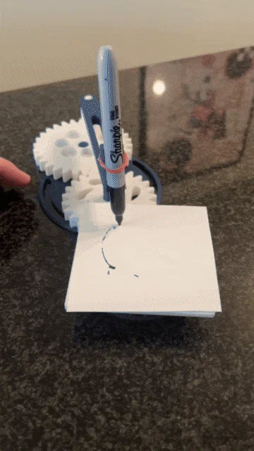 Máy spirograph dùng gear có thể điều chỉnh để thử nghiệm nhiều kiểu nét vẽ. Dễ in 3D, dễ lắp và vận hành; chỉ cần thêm Sharpie/marker, sợi thun, giấy 90×90mm và chút băng keo là dùng được.