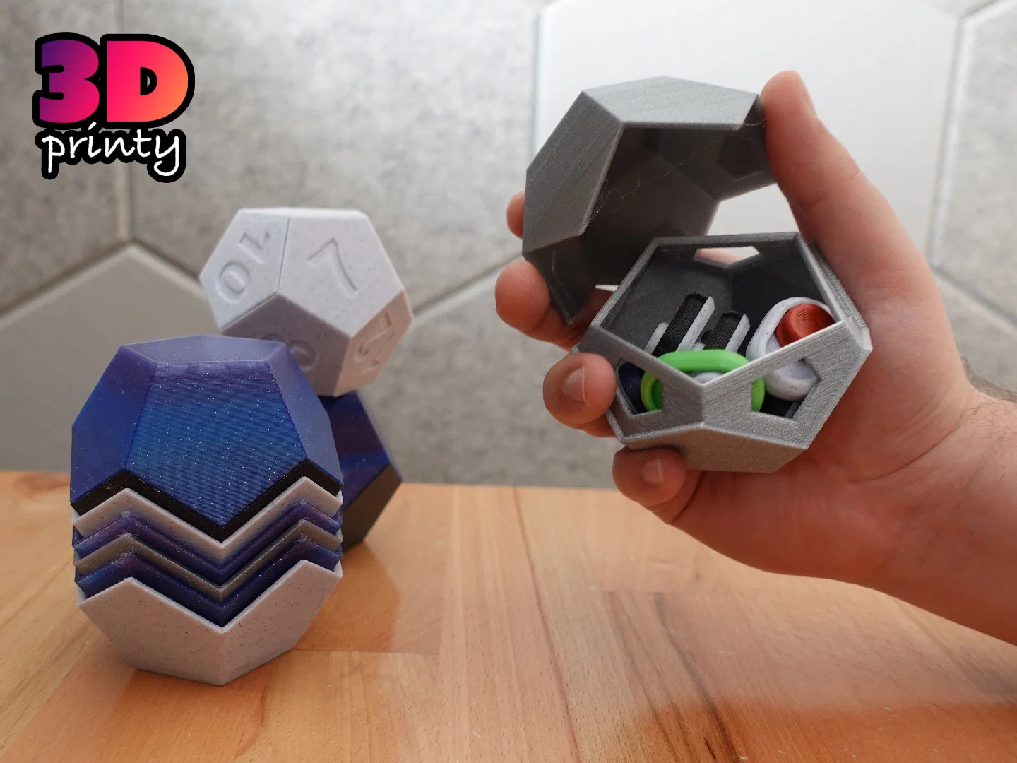 Hộp dạng dodecahedron (12 mặt) với nắp snap-on bấm khớp. Không cần supports nhưng cần tuning kỹ để fit đẹp. Có tuỳ chọn kiểu Plain/Numbers và nhiều mức clearance từ Loose tới Impossibly Tight.