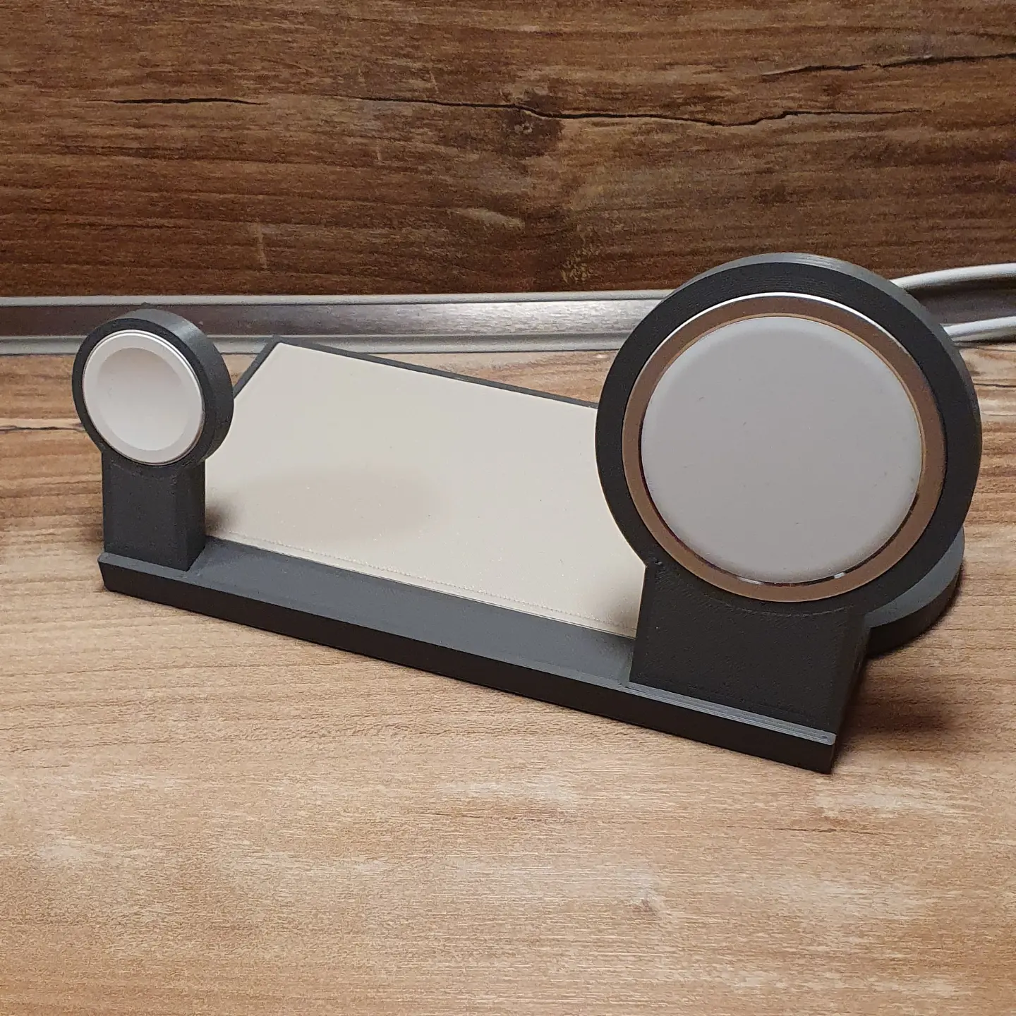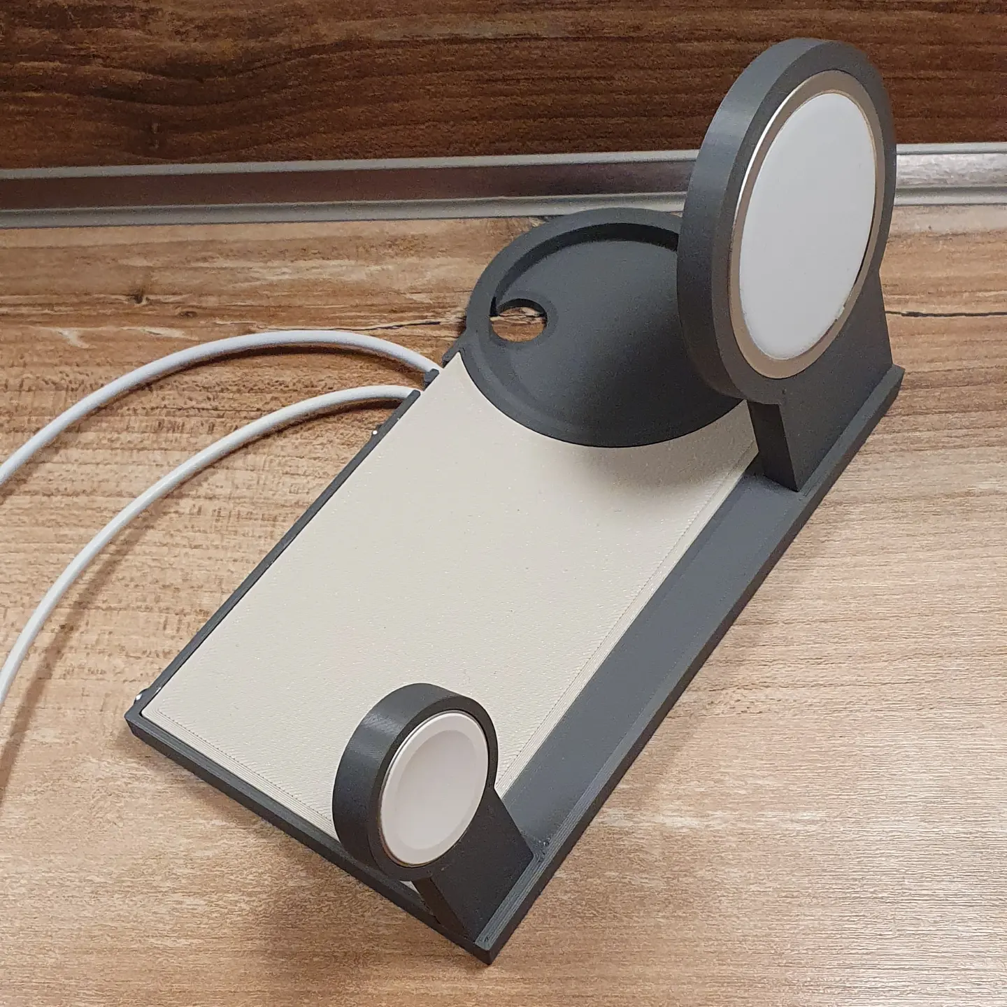 iPhone Ladestation là trạm/đế sạc cho điện thoại, đồng hồ và iPod. Thiết kế được làm tinh gọn hơn, dễ in 3D, dây cáp gom ra phía sau. Dưới nắp có khoang nhỏ để thêm tấm kim loại tăng trọng lượng nhưng để không cũng đứng vững.