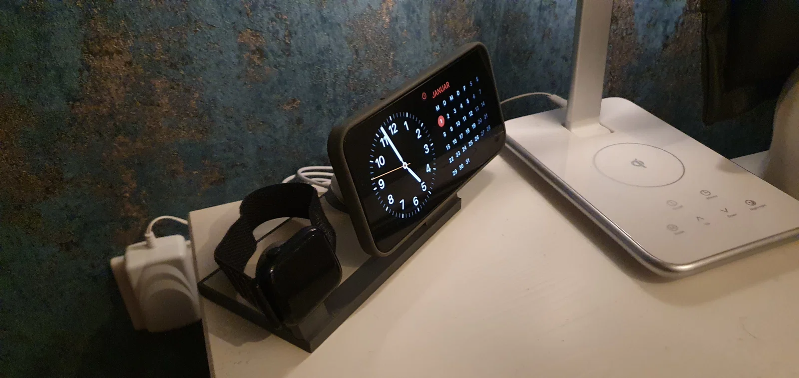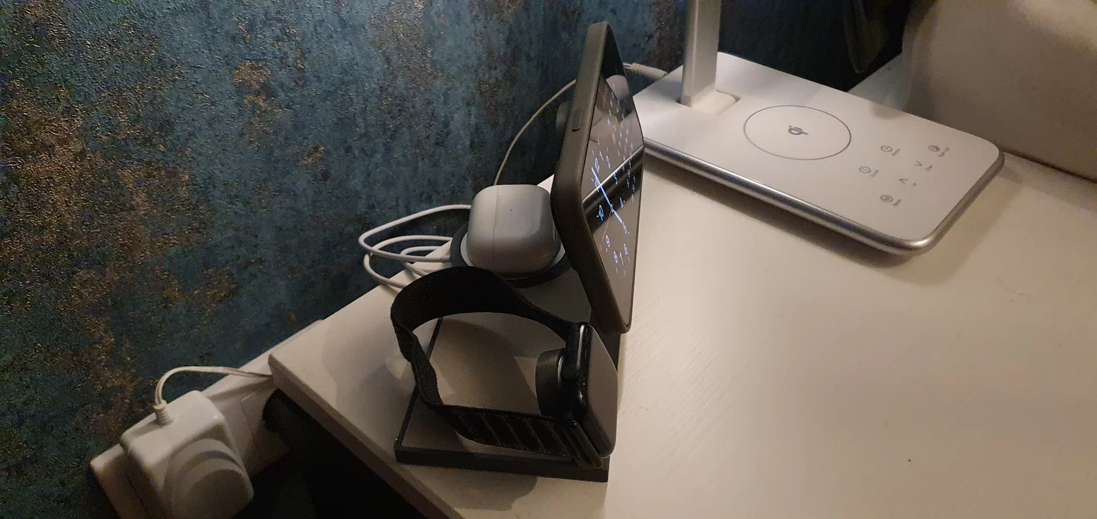 Ladestation iPhone cho điện thoại, đồng hồ và iPod. Mình thiết kế nó mảnh/nhẹ hơn một chút. In được khá dễ và dây cáp được gom lại phía sau. Bên dưới nắp có một khoảng trống nhỏ để đặt một tấm kim loại hoặc vật tương tự nhằm tăng thêm trọng lượng. Nhưng để không thêm tạ thì nó vẫn đứng vững.