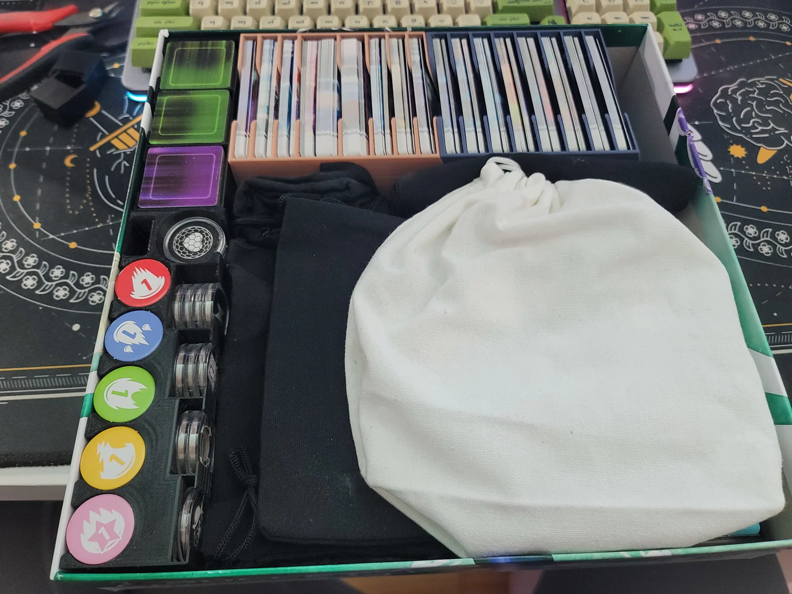 Phần để boards thì dài quá, không in vừa trên máy Mini. Bạn có thể cắt đôi trong PrusaSlicer rồi in mỗi nửa 2 lần, sau đó dán hai bên bằng CA glue. Mình làm đúng cách này vì mình chỉ có Mini và xài ổn luôn. Khe giữa boards và các khay thẻ có thể nhét vừa 2 trong 4 túi vải đen; 2 túi còn lại để cạnh túi trắng đựng bullets.